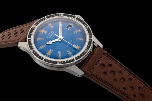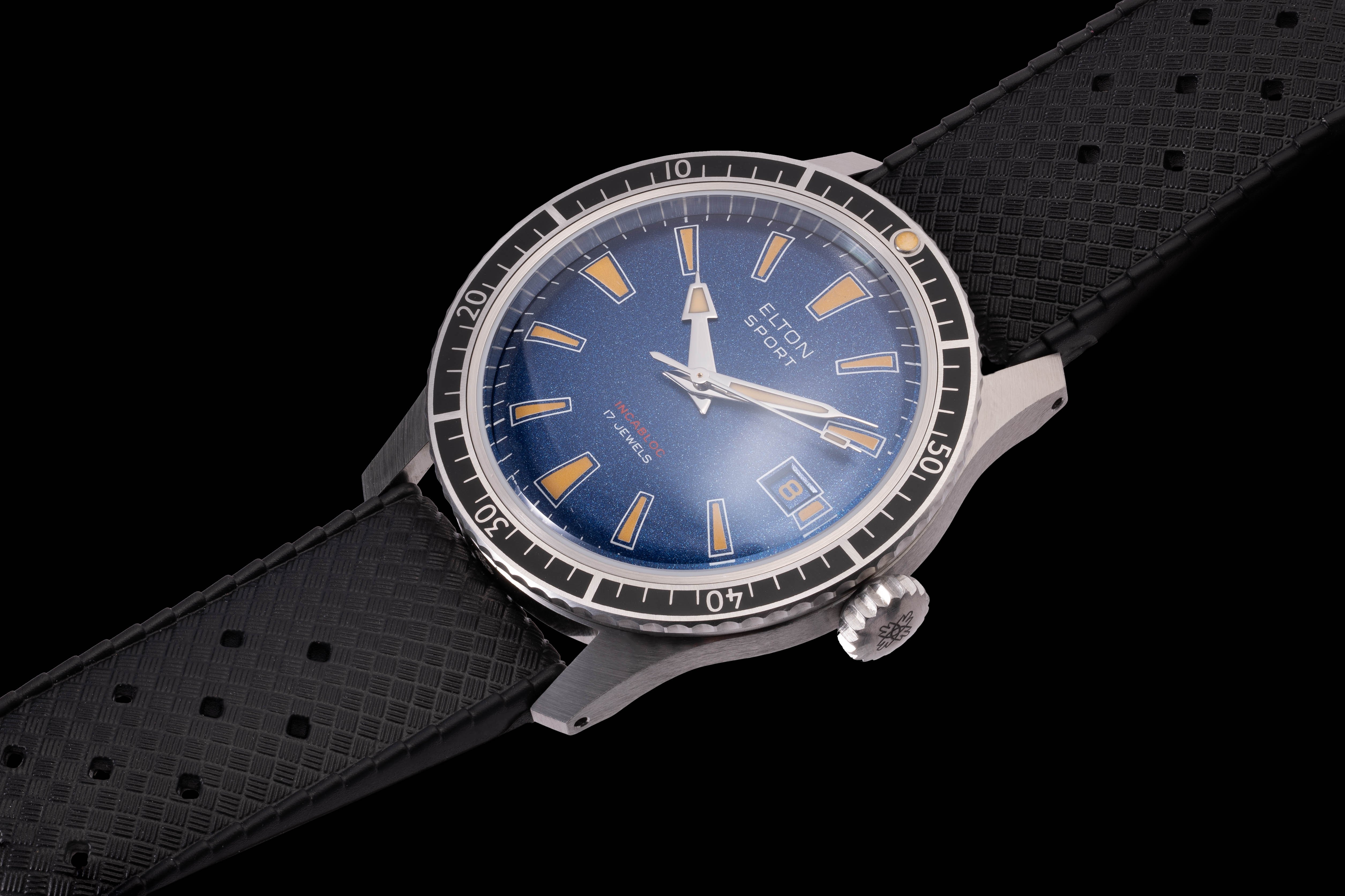 Od té doby sice uplynulo více než půl století, ikonický design však inspiruje dodnes. Odolné nerezové pouzdro klasických tvarů zdobí výrazný modrý číselník s dobře čitelnými žlutými indexy. Sportovní vzhled hodinek podtrhuje kontrastní otočný kroužek se sestupnou stupnicí a lumi bodem i kaučukový řemínek s nápaditým designem.