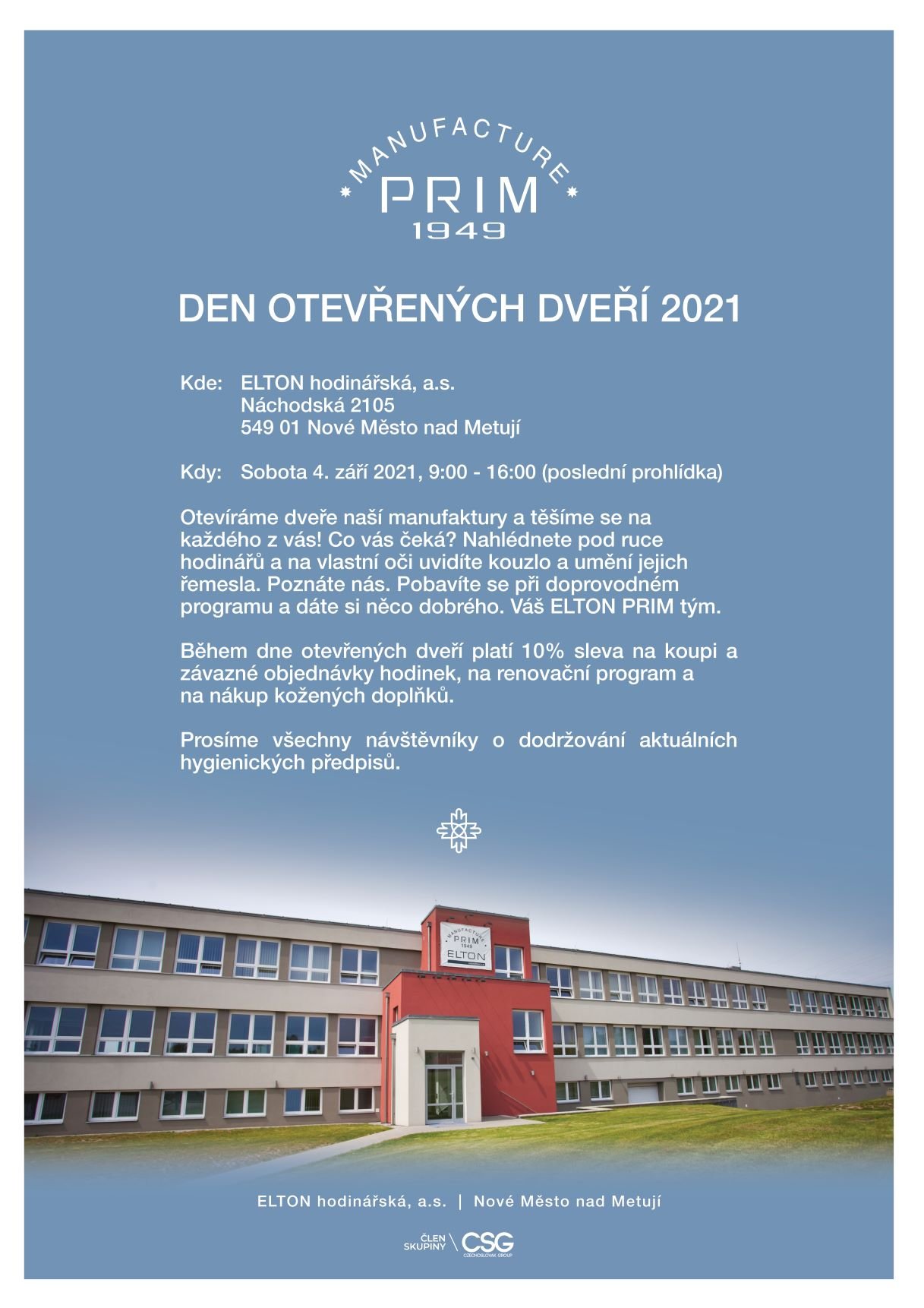 Pokud Vás zajímá výroba hodinek a jste fanoušky našich „primek“, rezervujte si v kalendáři sobotu 4. září 2021. Od 9 do 17 hodin (16:00 poslední prohlídka) vám opět otevřeme své brány, abyste se mohli podívat, jak vznikají tradiční české hodinky značky PRIM. Naše výroba hodinek v Novém Městě nad Metují se může jako jediná v České republice pochlubit historií sahající až do roku 1949.