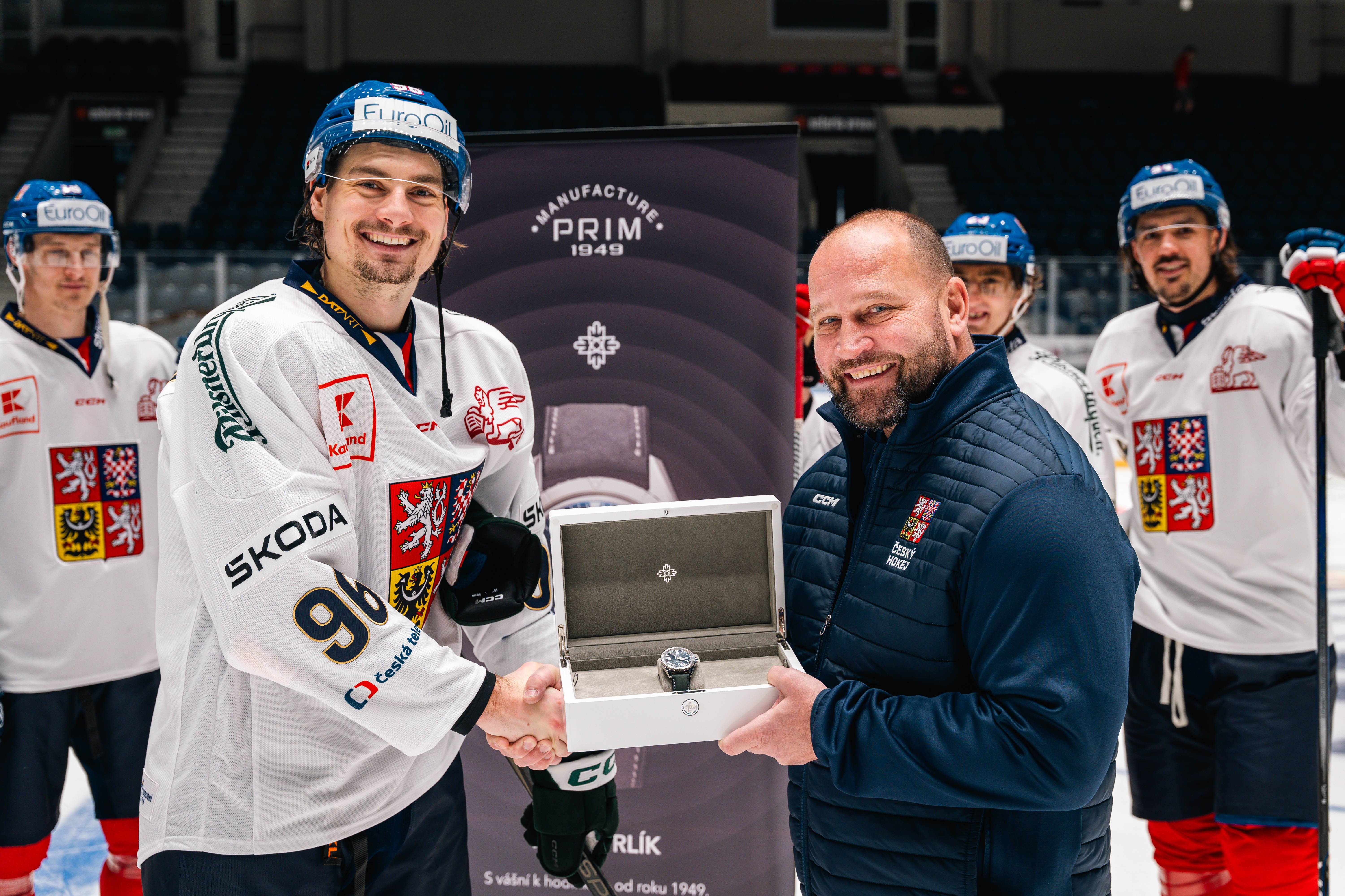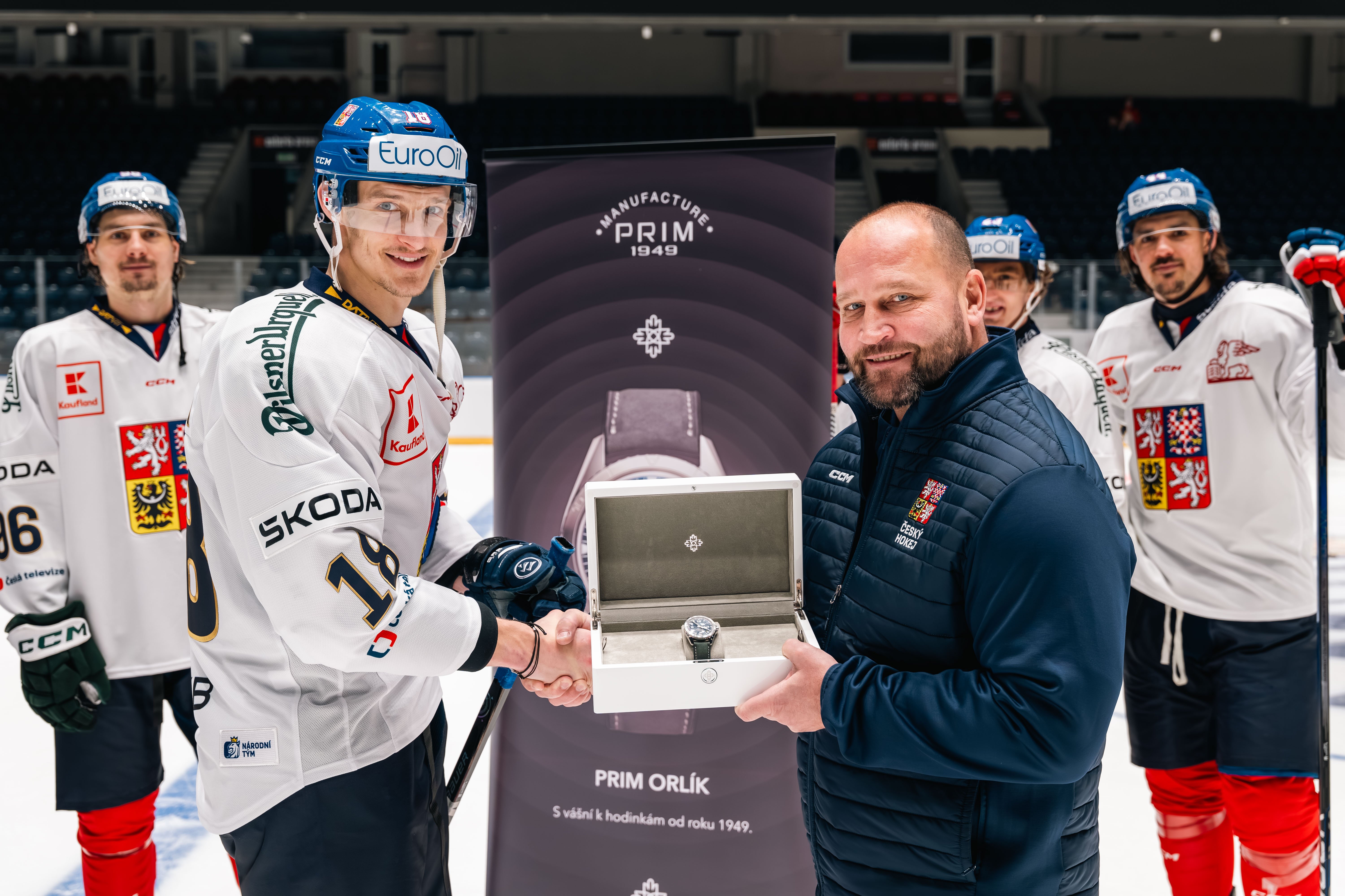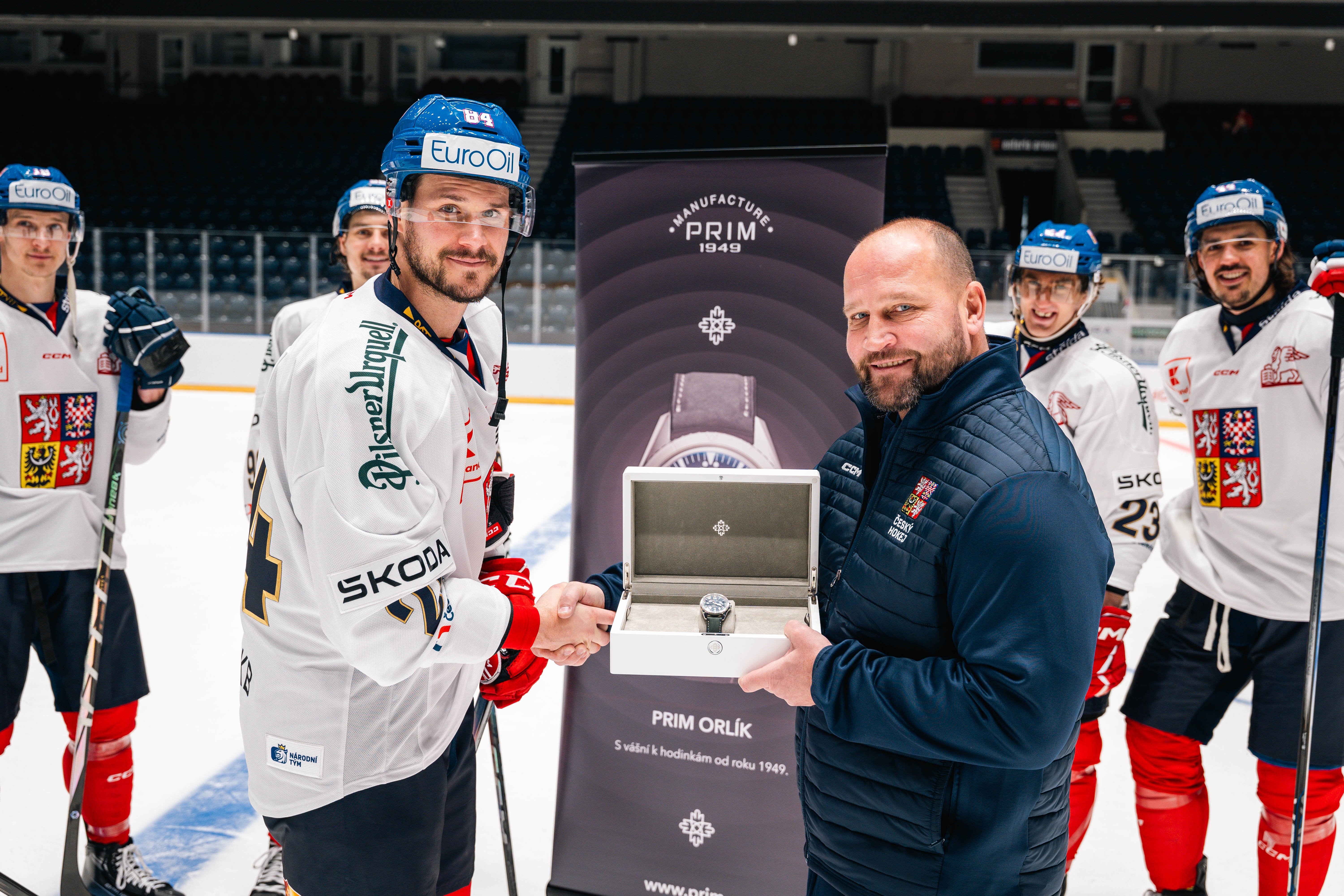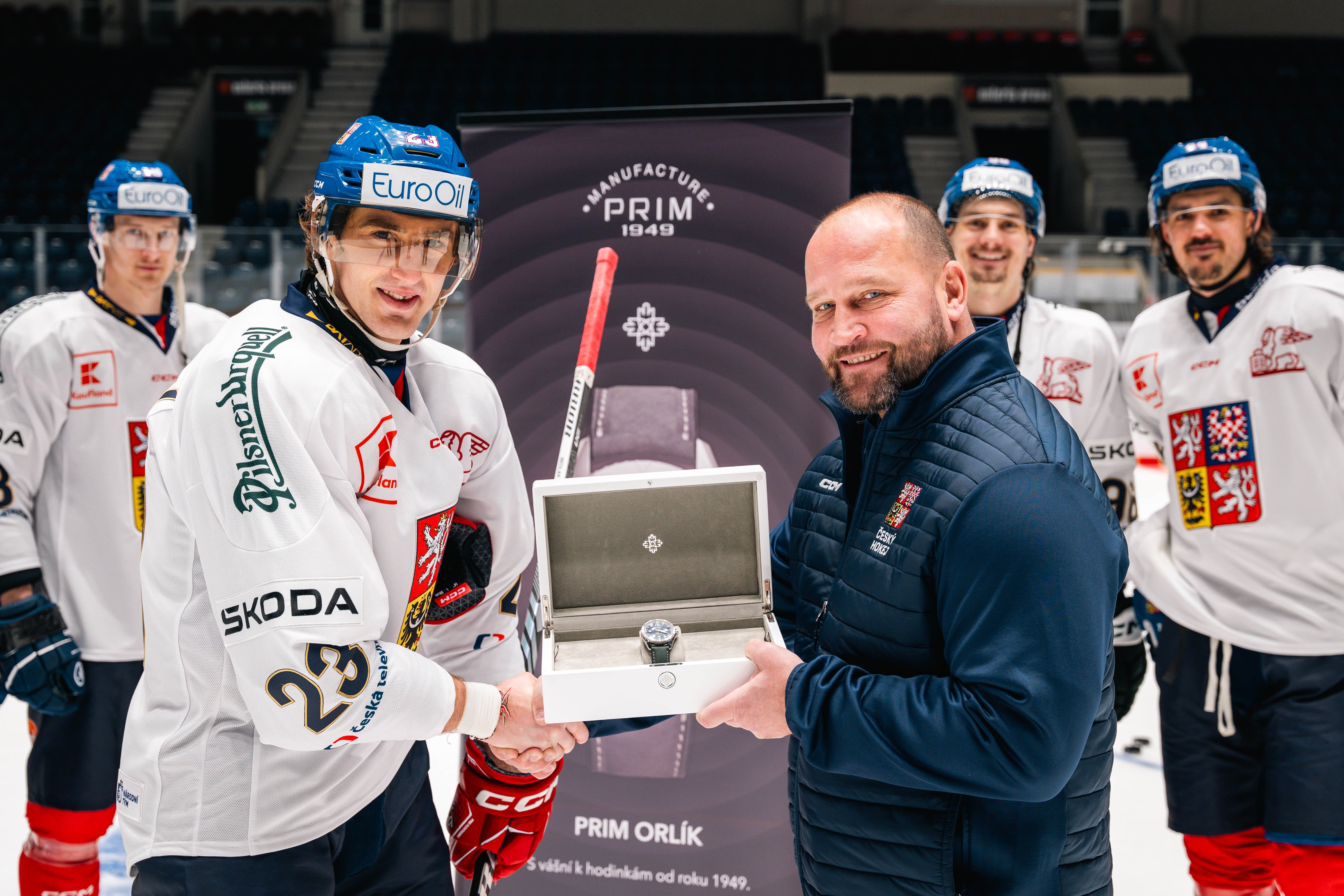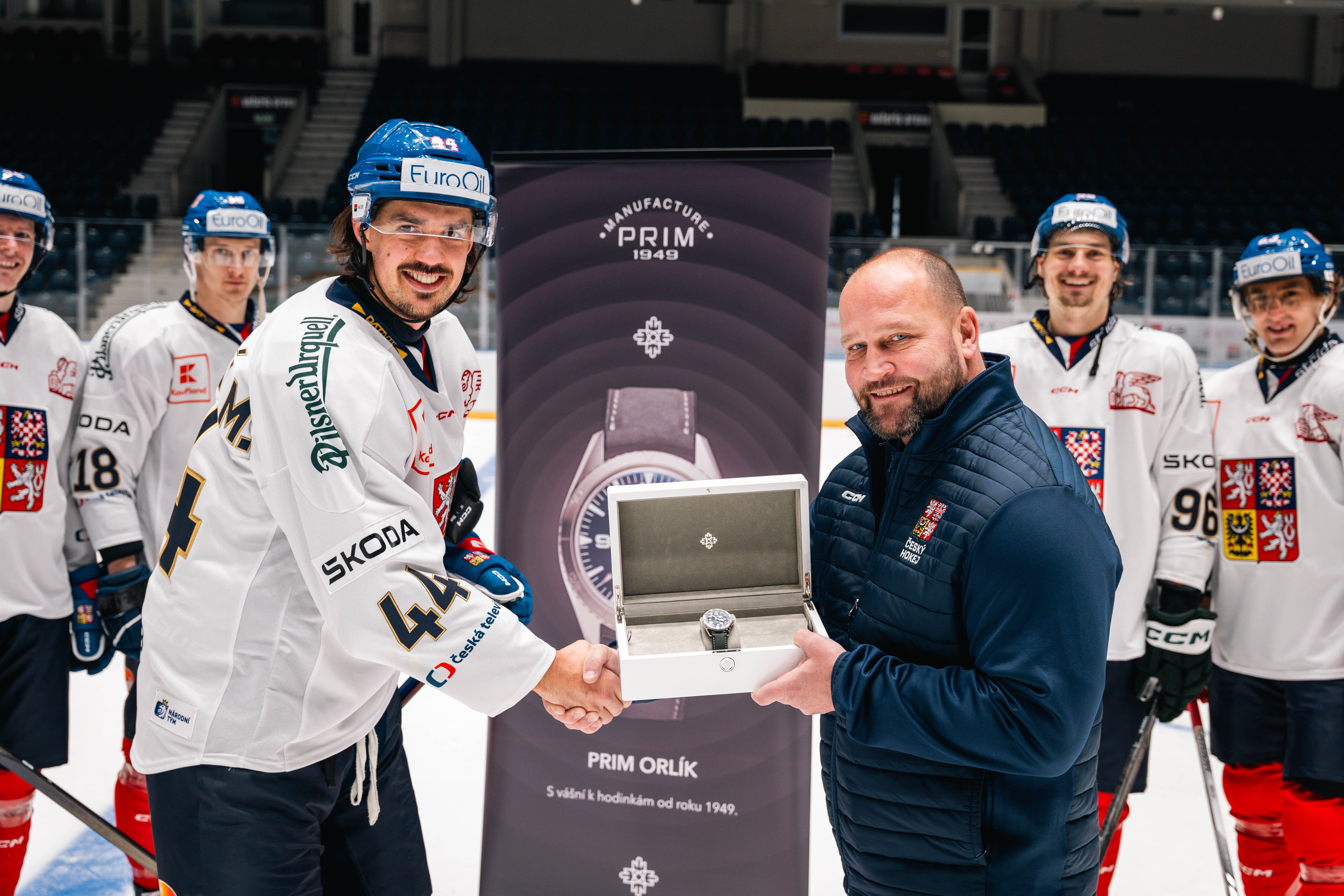 Tento týden si náš letošní vítězný hokejový tým převzal speciální edici PRIM Orlík! Stalo se tak na ledě v Pardubicích. Speciální design hodinek nese symboly velkého vítězství, respekt a velikou hrdost.