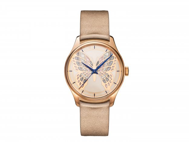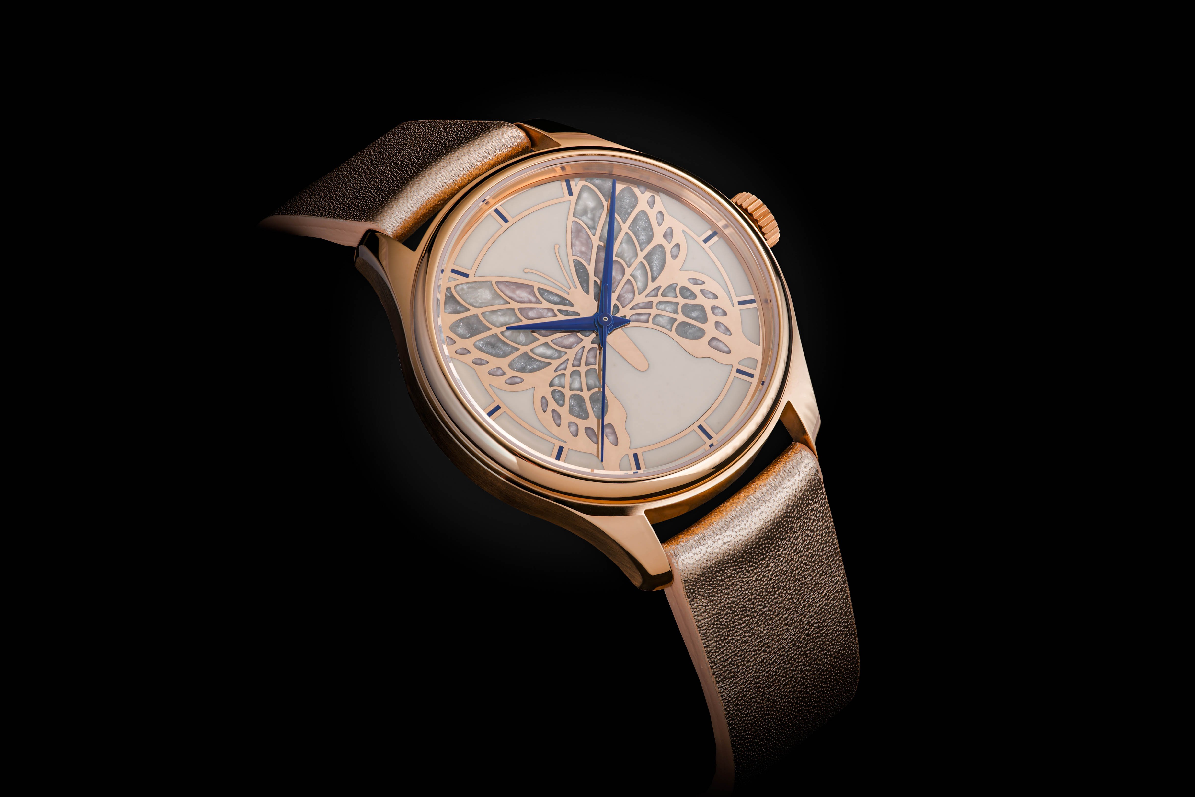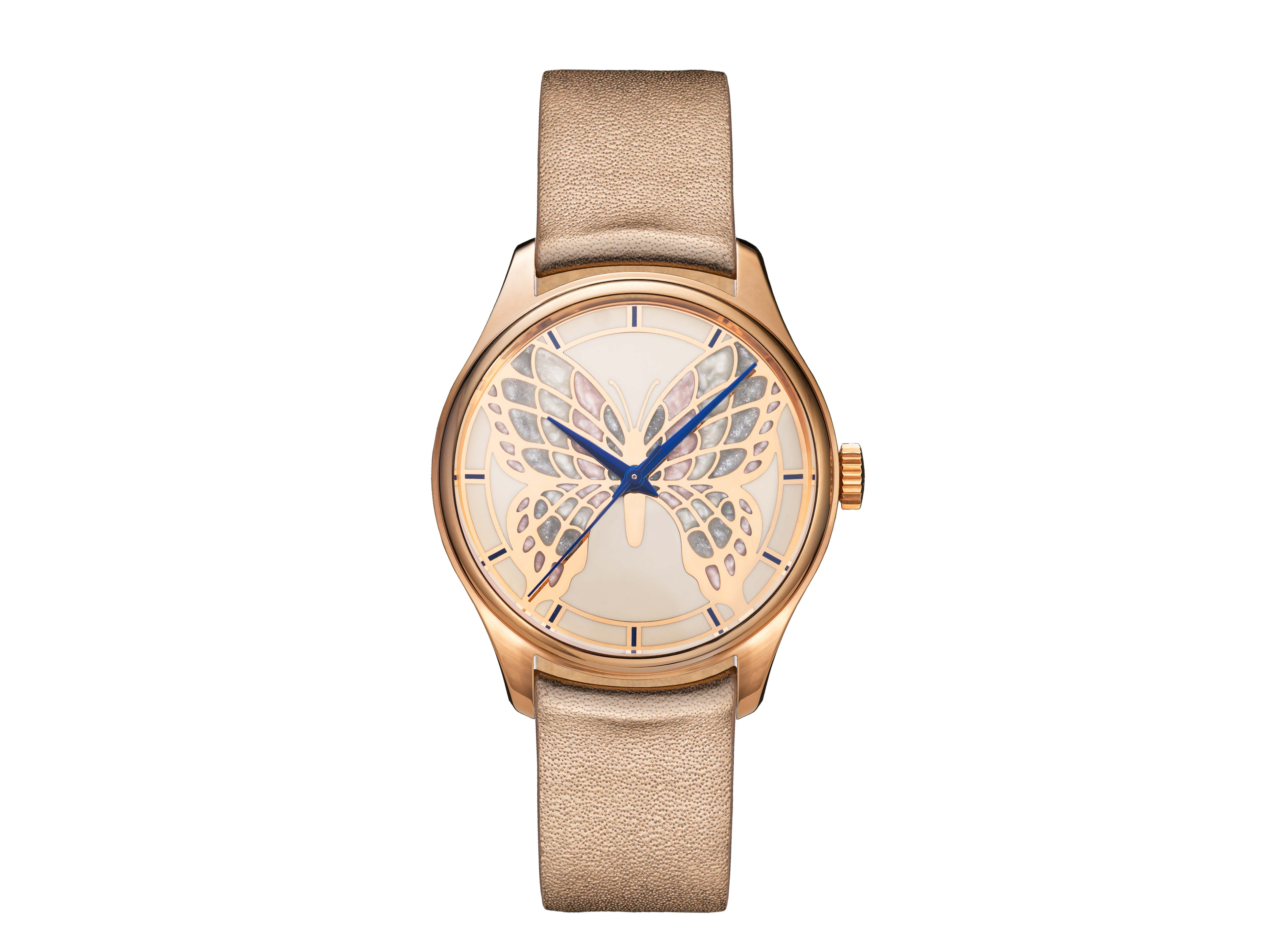 Dámský model PRIM ART v sobě snoubí křehkost motýlích křídel a mistrovské hodinářské umění. Limitovaná edice PRIM ART 2025 zaujme zlaceným číselníkem zdobeným jemnou siluetou motýlích křídel, ručně vytvořenou technologií HyCeram®. Náročný proces, který vyžaduje až 24 hodin soustředěné práce, spočívá v precizním nanášení jednotlivých barevných vrstev. Použití speciálního materiálu vytváří jemné perleťové odlesky, evokující povrch skutečných motýlích křídel. Harmonii barev doplňují modré ručky. Výsledkem je číselník, který se stává malým uměleckým dílem, podtrhující výjimečnost a jedinečnost každého kusu.
