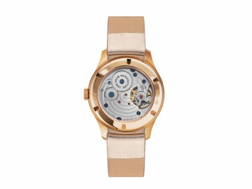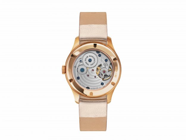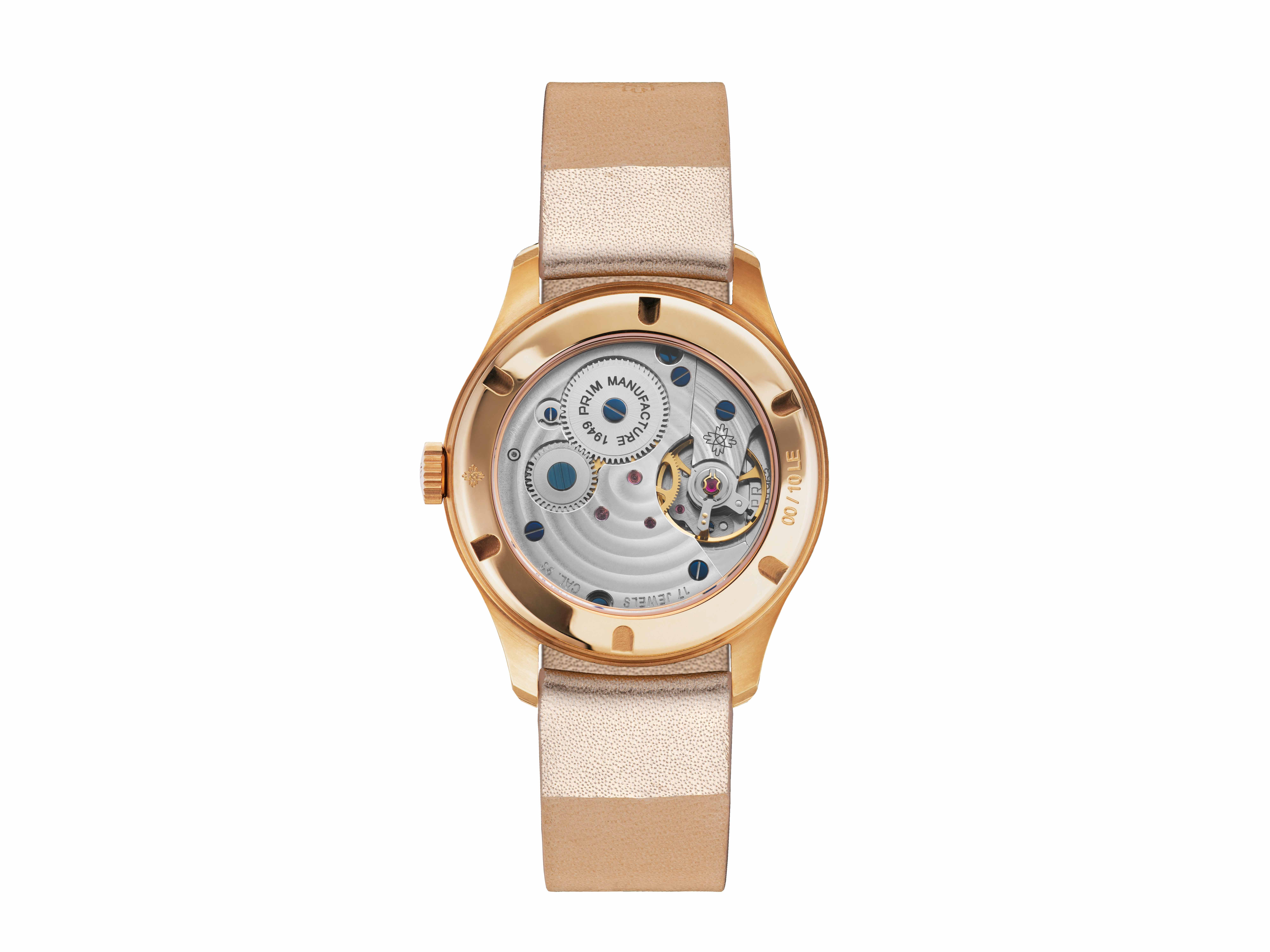 Prosklené zadní víko umožňuje fascinující pohled na inhouse mechanický strojek PRIM s ručním nátahem – ukázku dokonalé hodinářské práce.