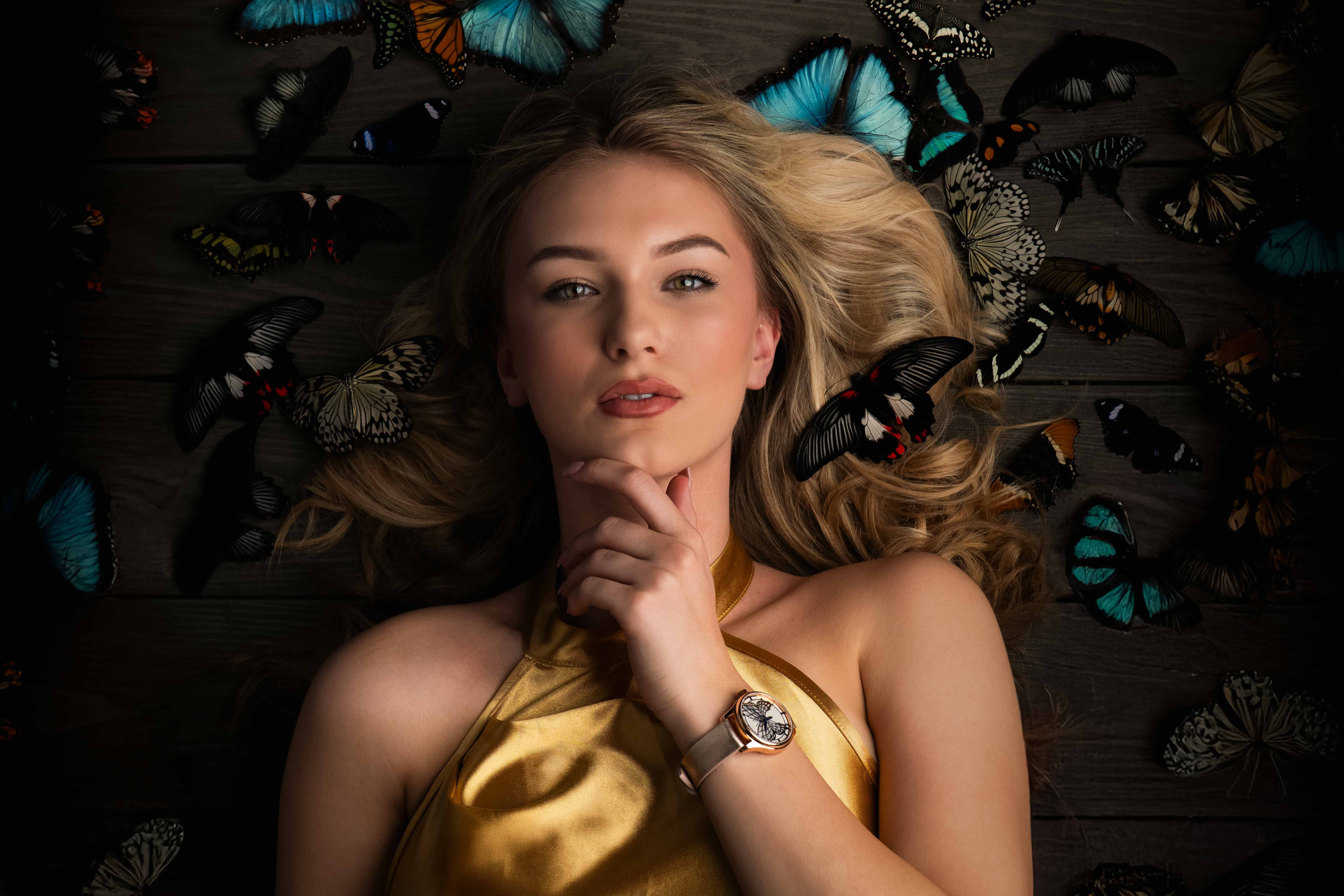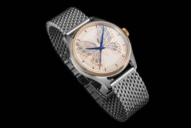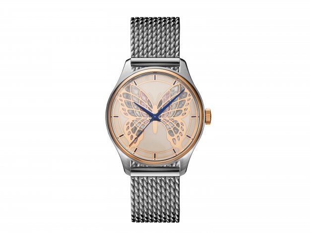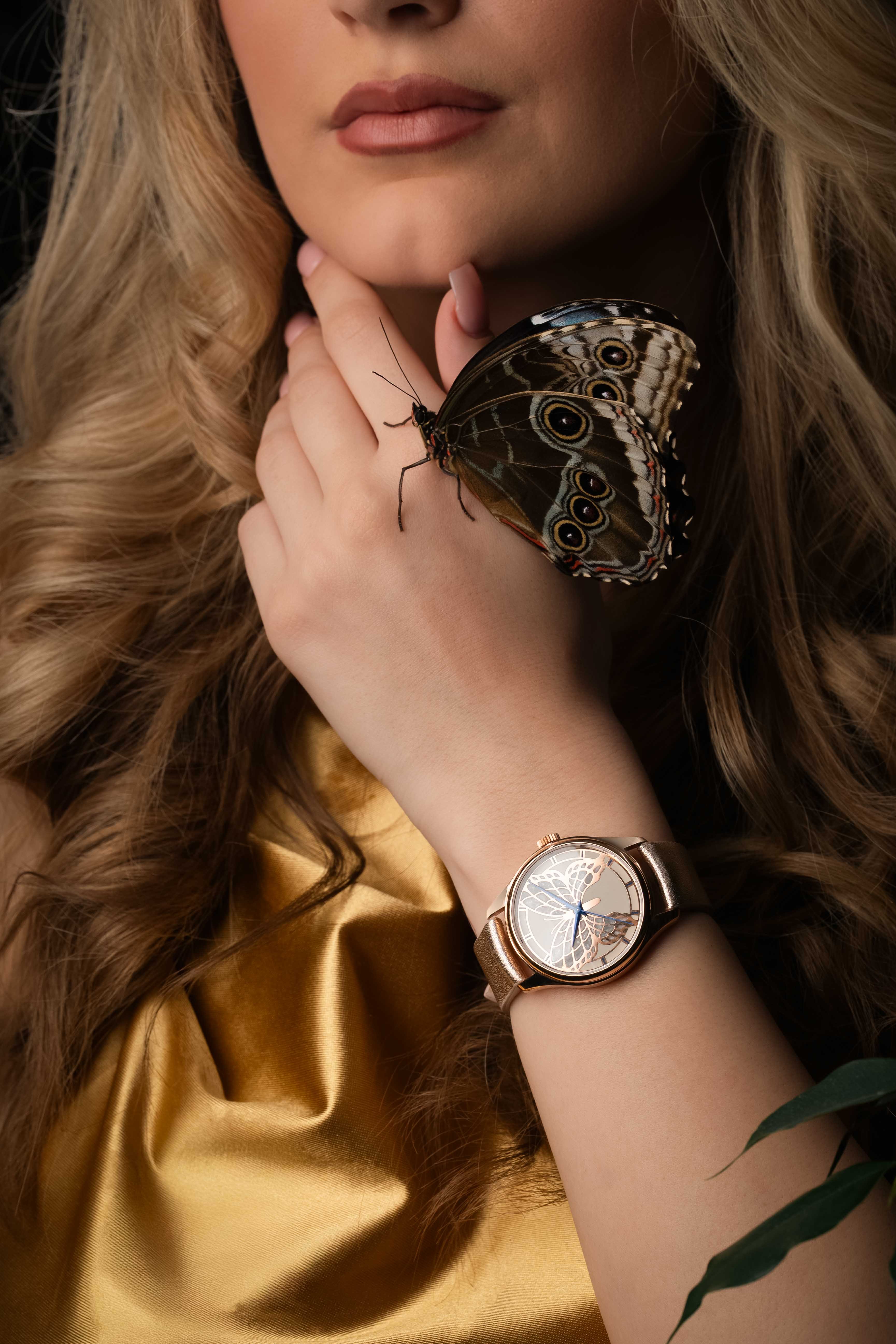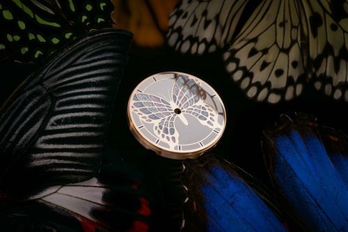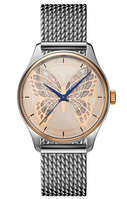 Dámský model PRIM ART v sobě snoubí křehkost motýlích křídel a mistrovské hodinářské umění. Limitovaná edice PRIM ART 2025 zaujme zlaceným číselníkem zdobeným jemnou siluetou motýlích křídel, ručně vytvořenou technologií HyCeram®. Náročný proces, který vyžaduje až 24 hodin soustředěné práce, spočívá v precizním nanášení jednotlivých barevných vrstev. Použití speciálního materiálu vytváří jemné perleťové odlesky, evokující povrch skutečných motýlích křídel. Harmonii barev doplňují modré ručky. Výsledkem je číselník, který se stává malým uměleckým dílem, podtrhující výjimečnost a jedinečnost každého kusu.