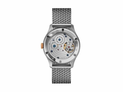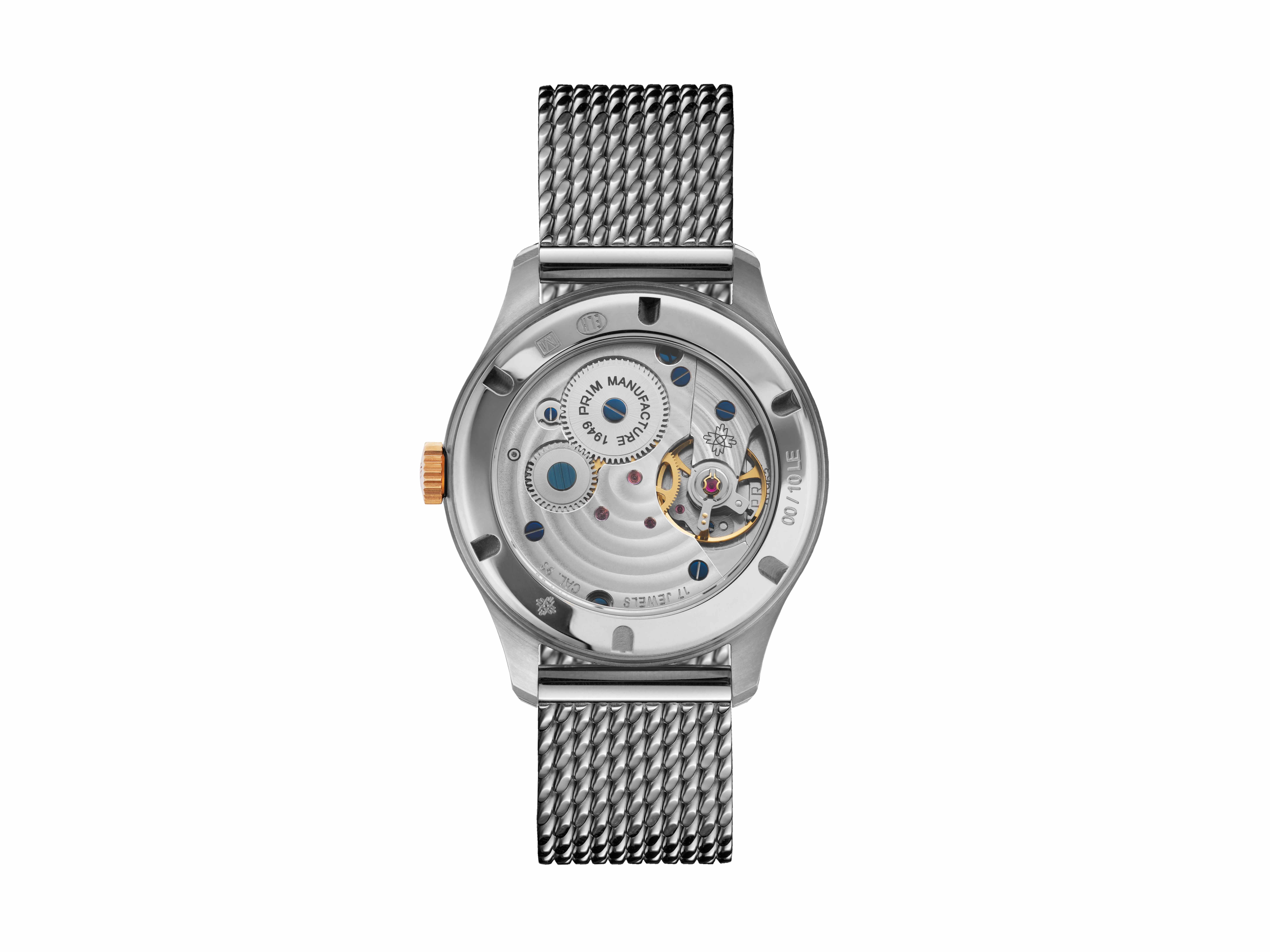 Prosklené zadní víko umožňuje fascinující pohled na inhouse mechanický strojek PRIM s ručním nátahem – ukázku dokonalé hodinářské práce.