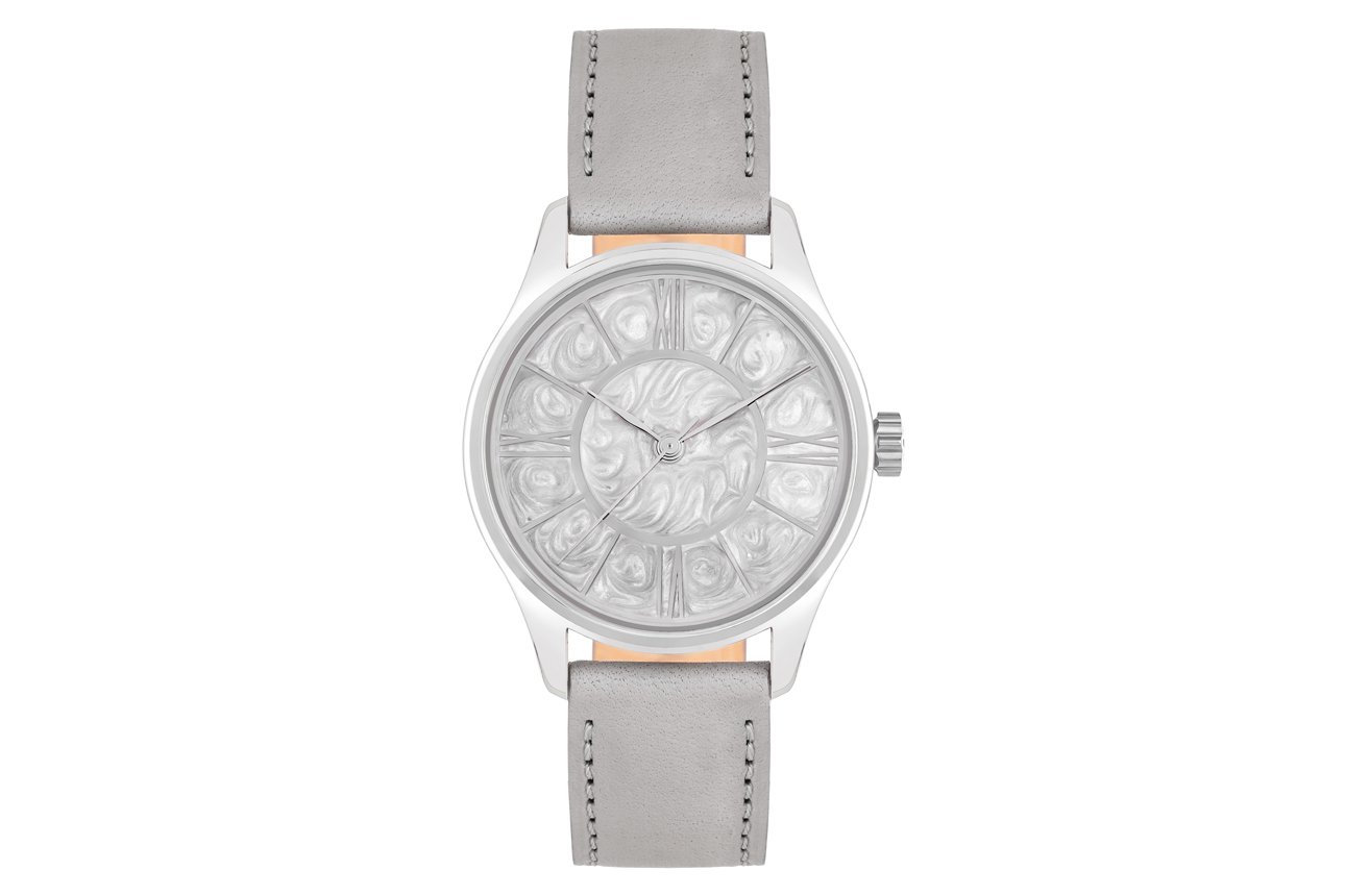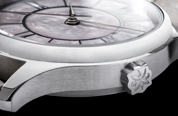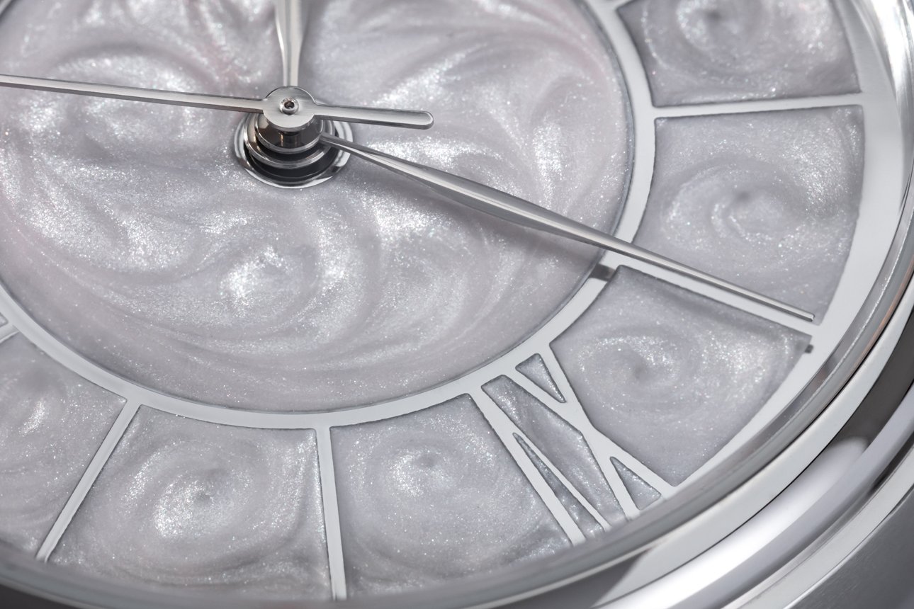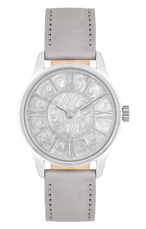 Pro číselník zvolili naši designéři keramiku v dekoru perleti s decentním leskem, který mistrně využívá lomu světla. Číselník je ručně vyrobený, každý kus je tedy jedinečný. Na místě indexu 3 upoutá pozornost další zajímavý prvek. Trojku nahrazuje římská číslice XV, jako připomínka 15 let od zvolení Taťány Gregor Brzobohaté Miss ČR a Miss World. Díky zeštíhlenému pouzdru evokuje vzhled hodinek křehkost, čistotu a ryzí eleganci. Tento dojem podporuje také speciálně navržený řemínek z dílny brašnáře Pavla Matouše.