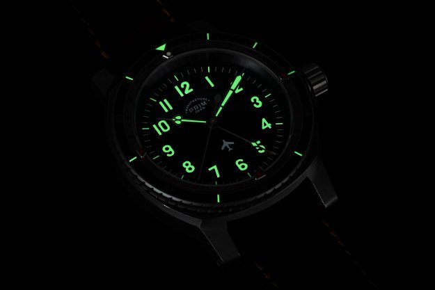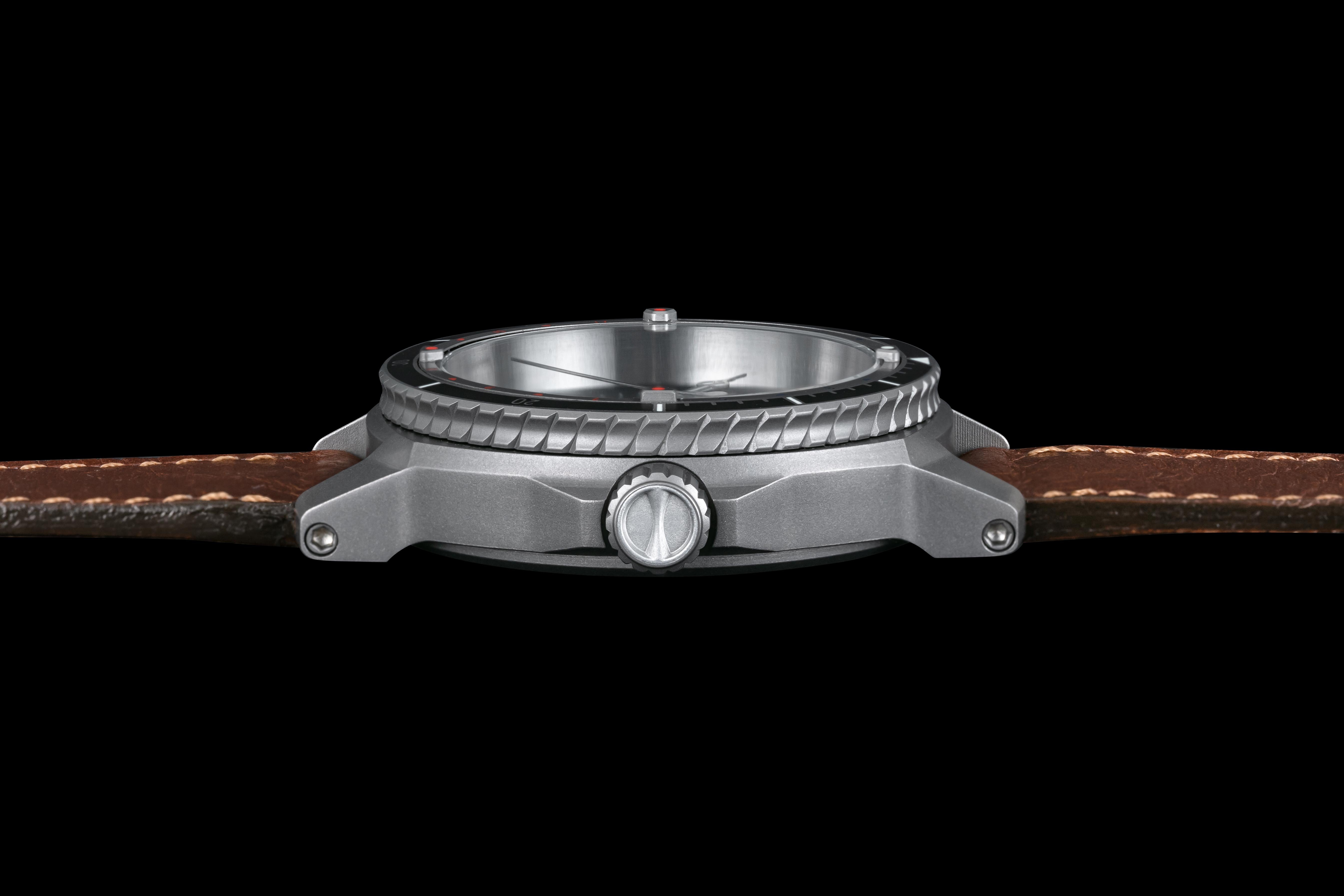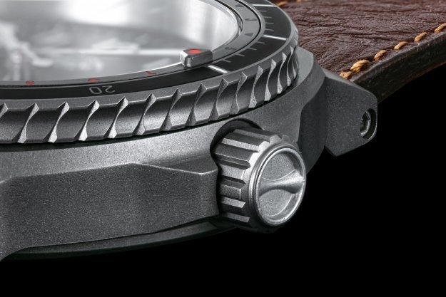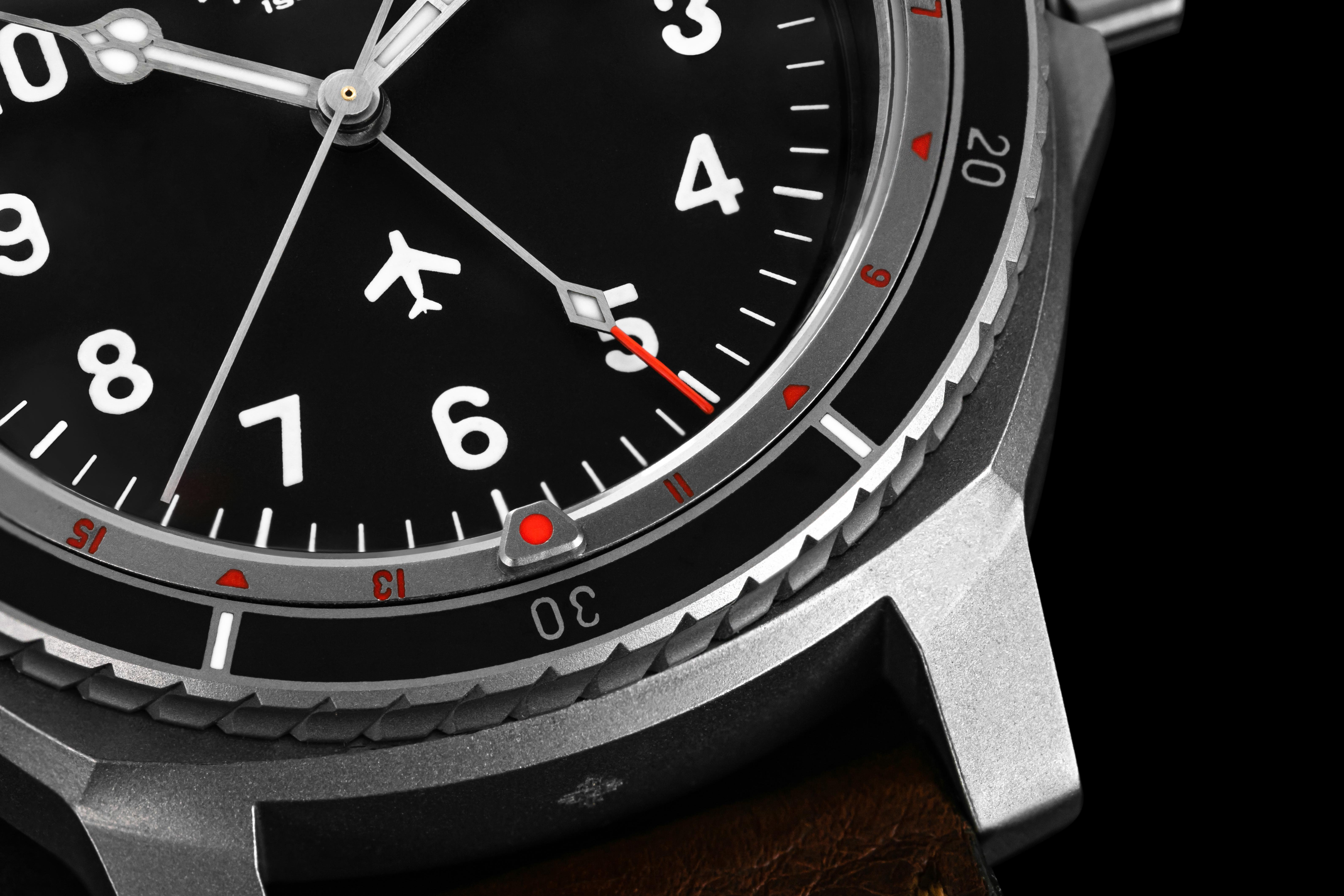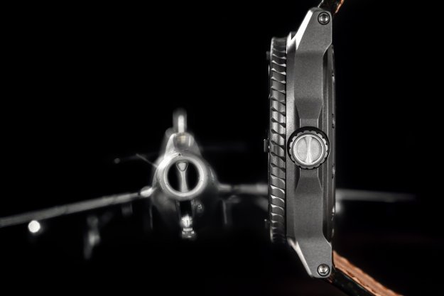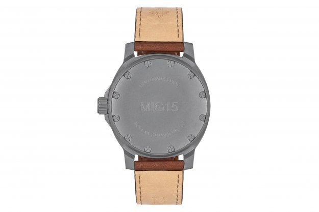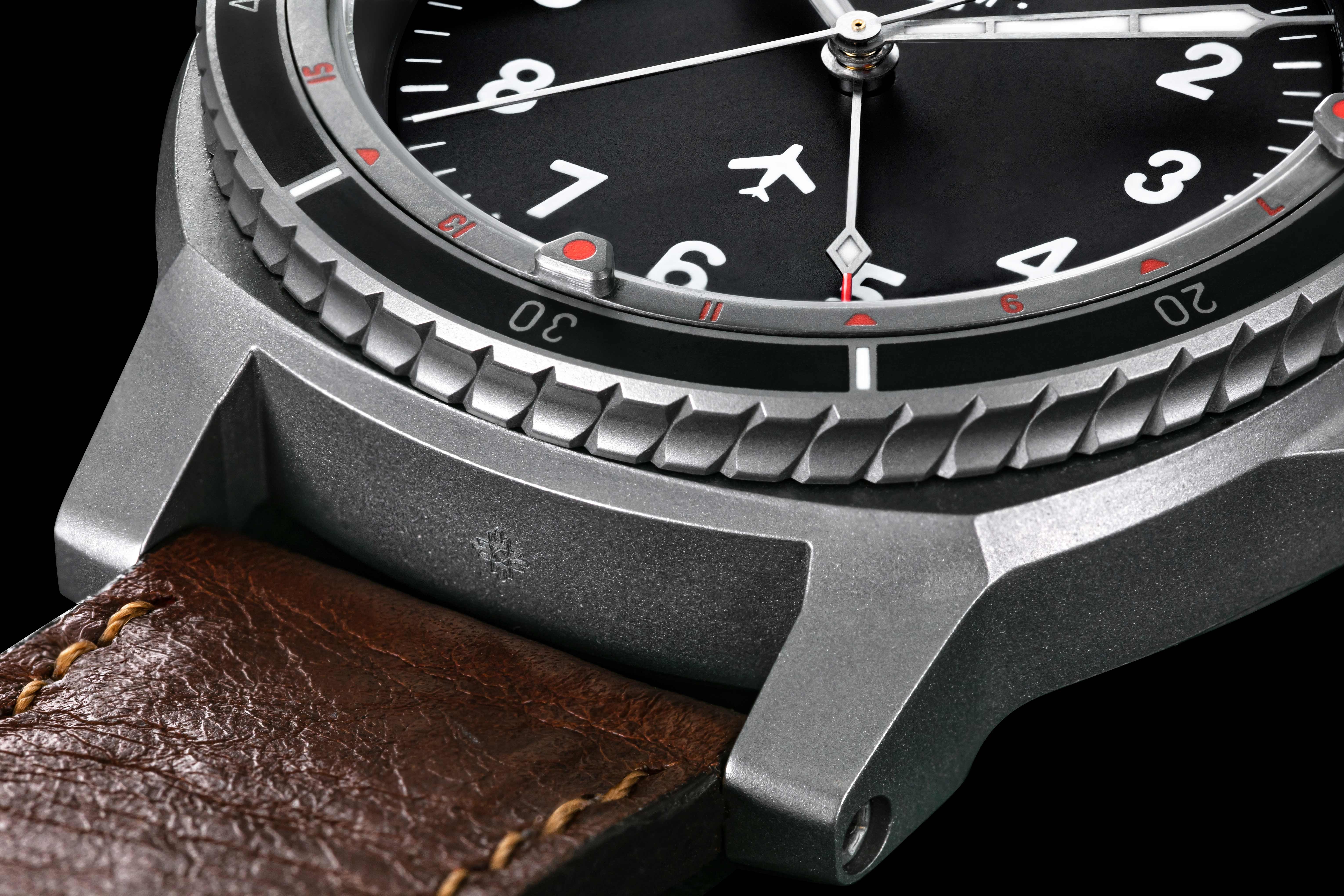 Letecké hodinky musí být odolné a robustní. Vydržet vše, ale zároveň zůstat relativně lehké. Při přetížení je znát každý gram navíc. Ideálním materiálem se proto stal titan, ze kterého je vyrobeno pouzdro i spona. Ani ta nesmí nikde překážet a zároveň spolehlivě držet hodinky na zápěstí. Korunka má tvar vzduchového otvoru na přídi letadla MIG15. Detail, který dodal letounu jeho charakteristický vzhled. Navíc v sobě ukrývá i kousek historie. Část materiálu korunky pochází přímo ze stíhačky a každá je tedy jedinečným originálem.