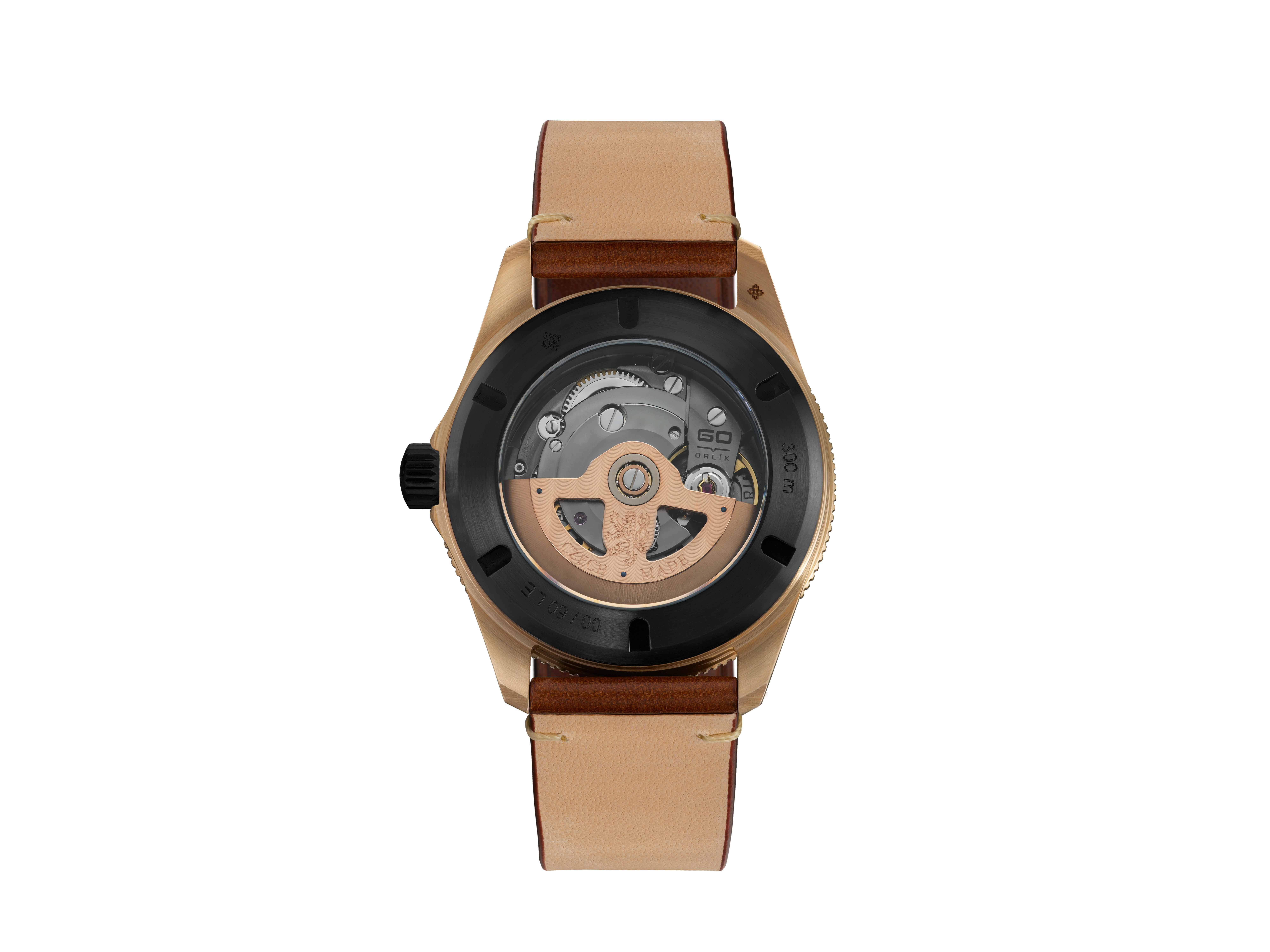 Vizuální charakter doplňují výrazné luminiscenční body, které zajišťují perfektní čitelnost ve dne i v noci. Safírové sklíčko s antireflexní vrstvou chrání číselník a zároveň nabízí vysokou odolnost vůči poškrábání. Průhledné zadní dýnko odhaluje zlatě zdobený in-house mechanický strojek s ručním nátahem, vyráběný přímo v Novém Městě nad Metují. Celkové vodotěsnosti 300 metrů bylo dosaženo díky důmyslné konstrukci pouzdra i detailnímu testování každého kusu. Model je tak nejen krásný, ale i odolný – připravený obstát v jakémkoli prostředí.
