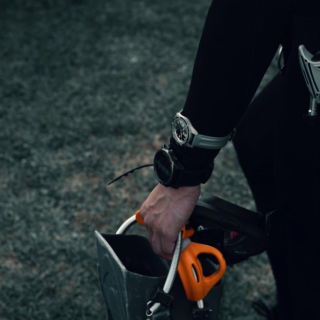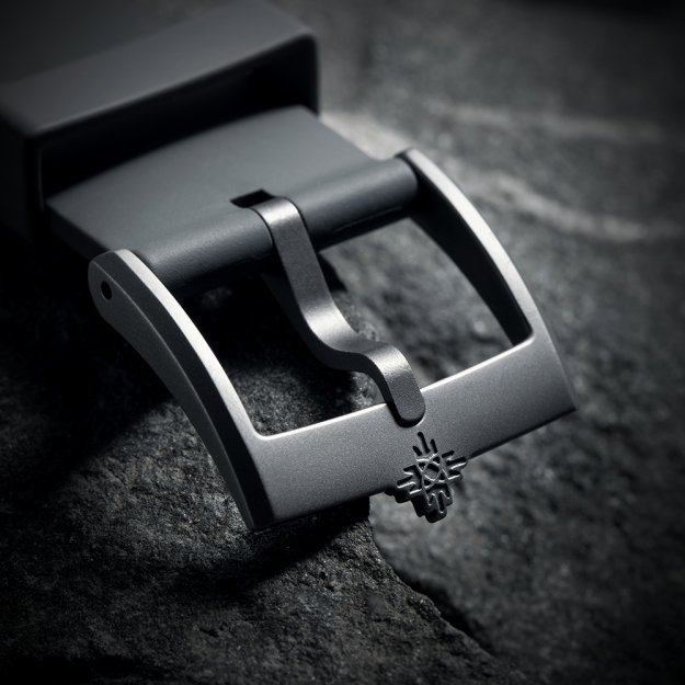 Hodinky jsou dodávány na šedém kaučuku se sponou s manufakturním piktogramem, v krabičce inspirované původním balením.