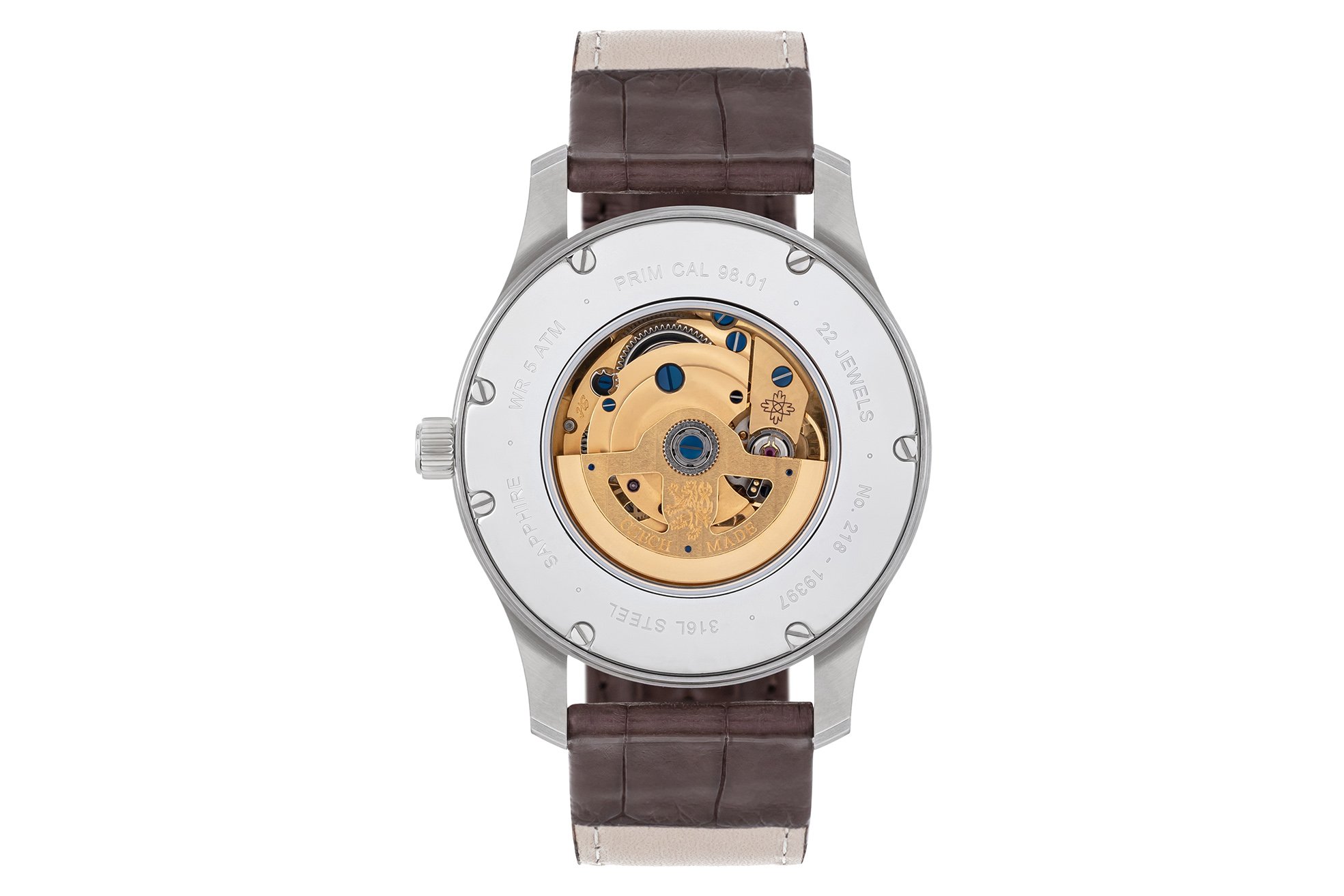 Hodinky jsou osazeny naším manufakturním mechanickým strojkem s automatickým nátahem, klasický vzhled doplňuje kvalitní kožený řemínek.