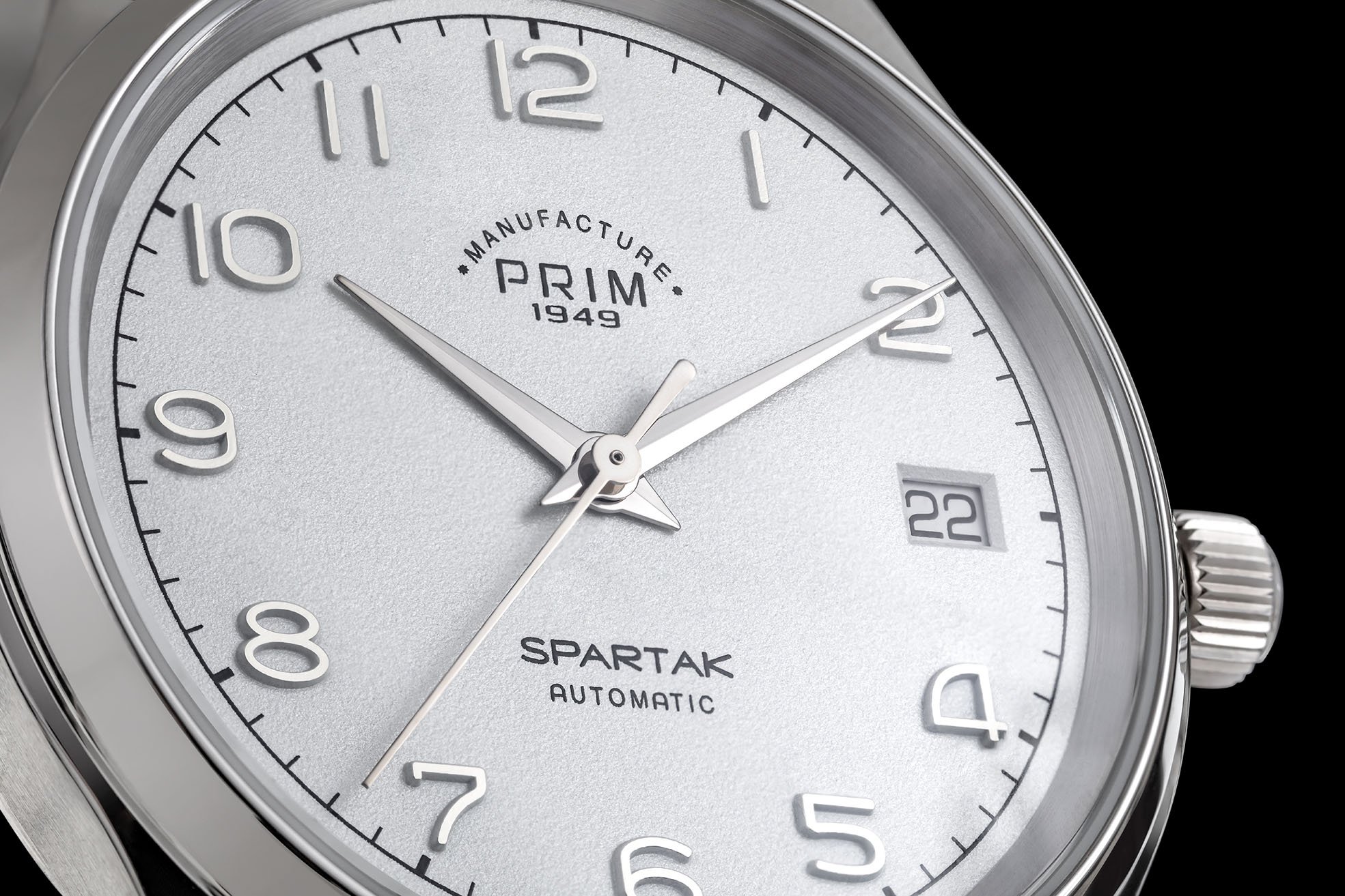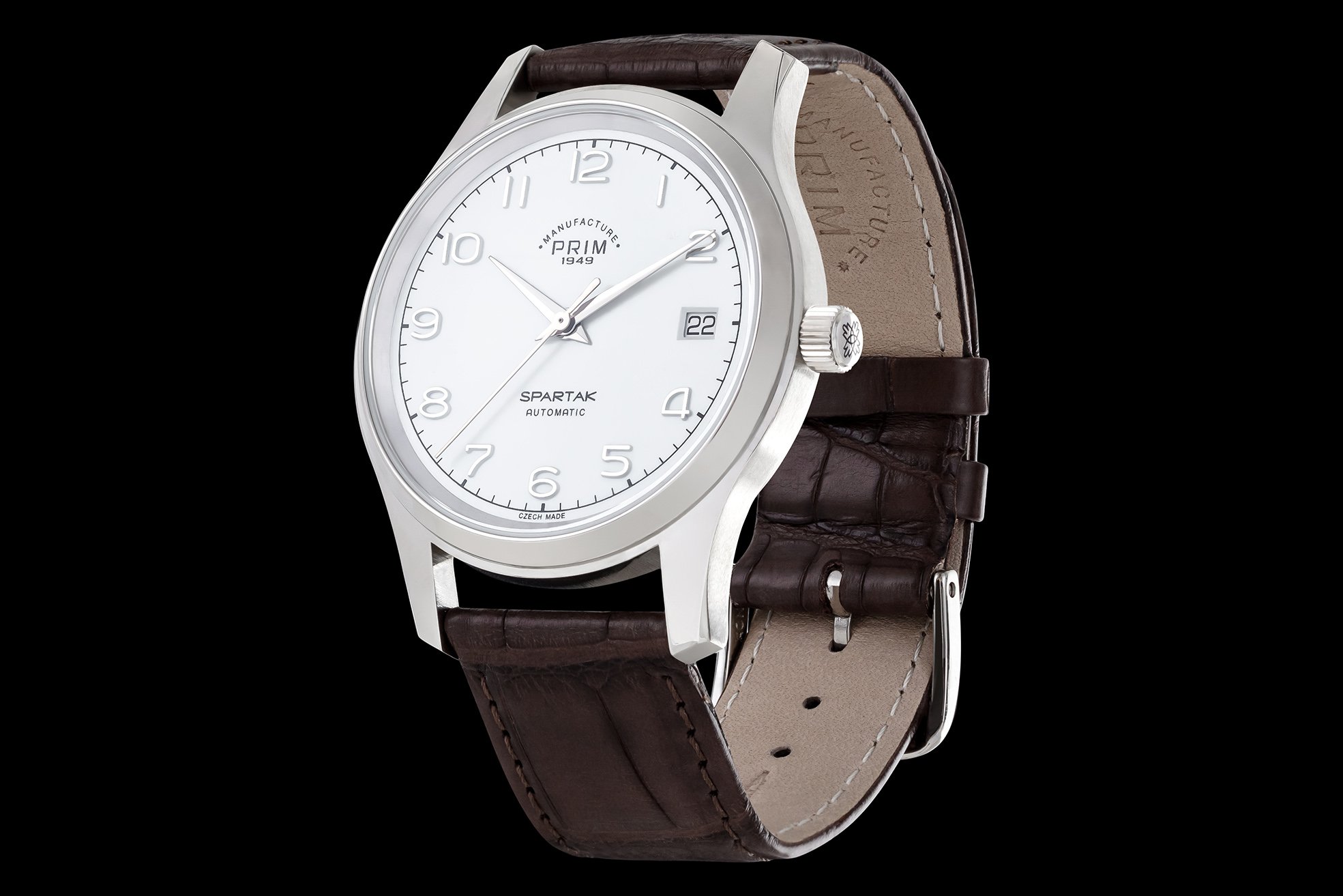 Výrazné pouzdro v kombinaci s čistým designem číselníku s výraznými a dobře čitelnými indexy dělá z modelu PRIM Spartak 43 hodinky vhodné nejen do společnosti, ale i na běžné denní nošení. Hodinky je možné na přání vyrobit i z drahých kovů, ať už se jedná o žluté, růžové, bílé zlato nebo platinu.