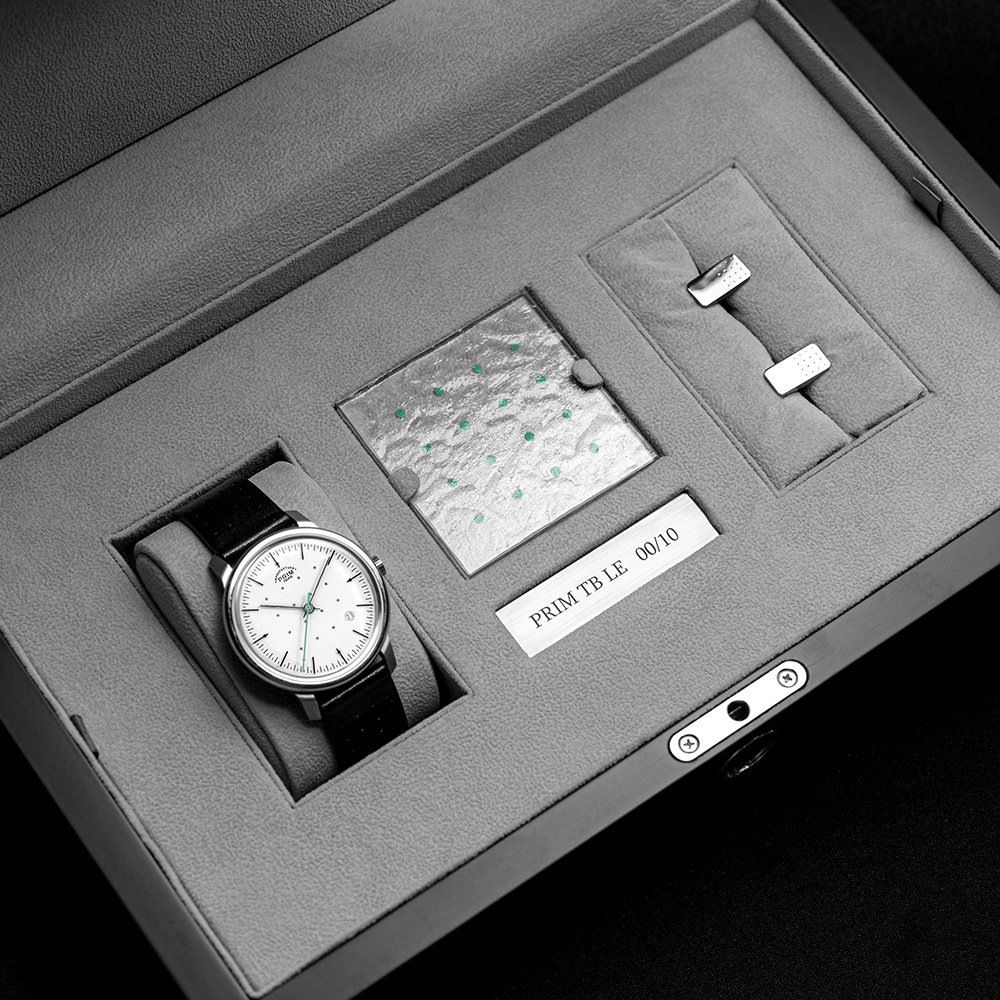 Elegantní tvary nově navrženého pouzdra zaujmou působivou kombinací leštěných a broušených ploch. Korunku zdobí písmeno „B“ z historického loga firmy Baťa z 20. let minulého století. Její obvod je vyfrézován do tvaru pravidelných čtverců, které opět symbolizují modularitu. Model je osazen manufakturním strojkem PRIM s ručním nátahem. Výjimečnou edici vytvořili konstruktéři a designéři naší společnosti ve spolupráci s designérem Lukášem Tanečkem.