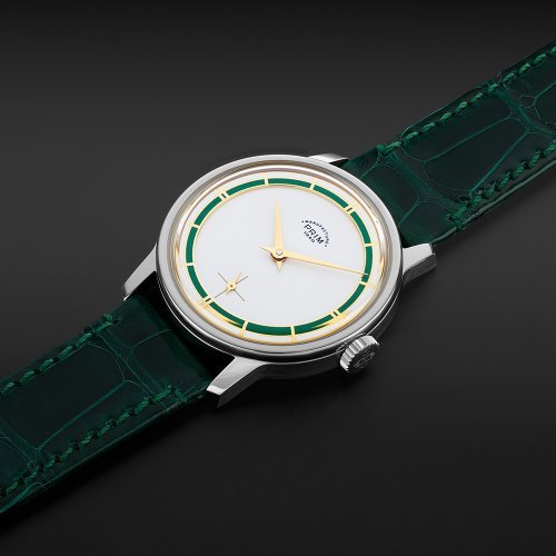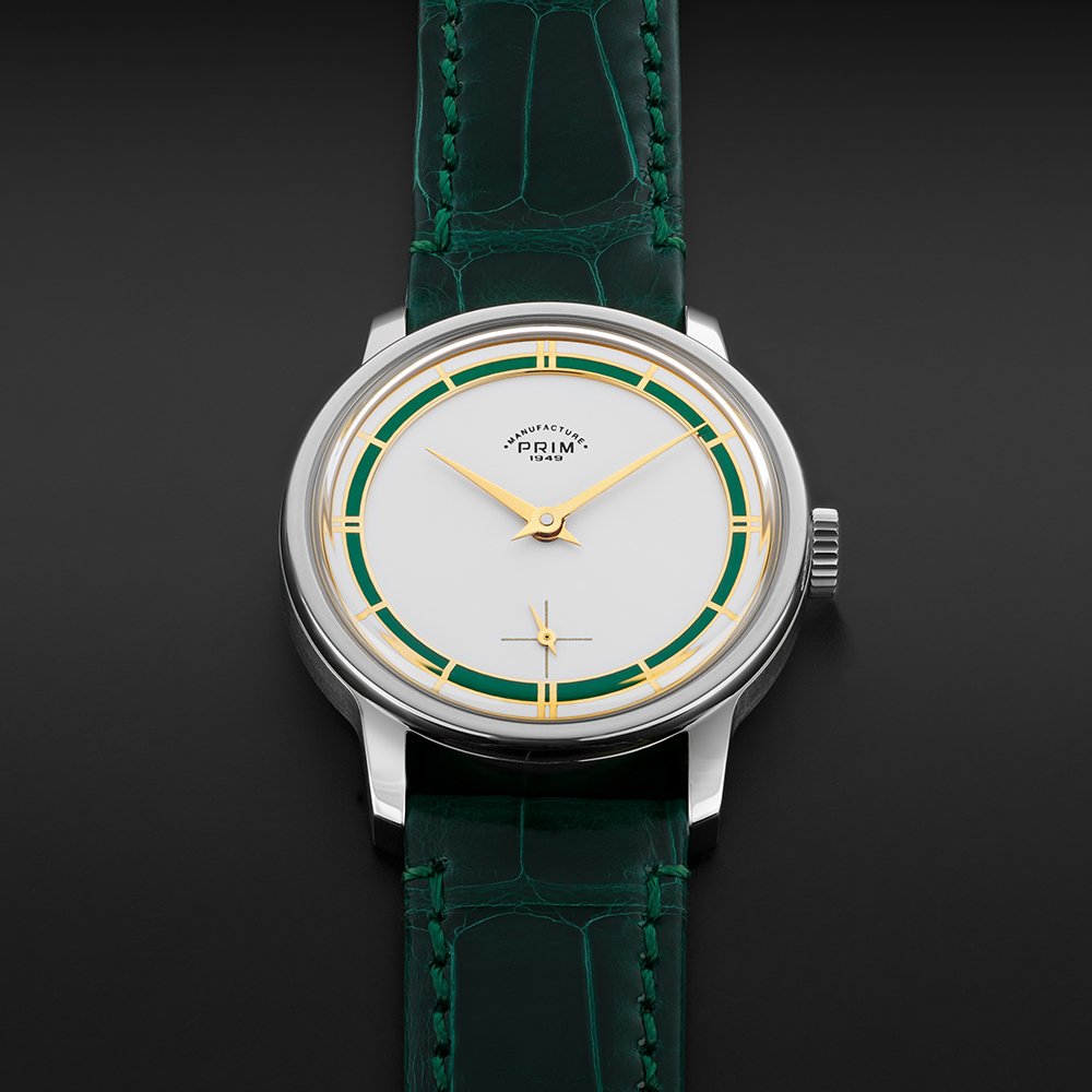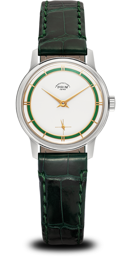 Nejvýraznějším prvkem designu limitované edice PRIM TRAKTOR 34 je bezpochyby propracovaný skládaný číselník. Kontrastní keramická objímka v atraktivní zelené barvě působivě vyniká na bílém podkladu. Elegantní vzhled hodinek je doladěn decentními zlacenými indexy a mimostřednou vteřinovou ručkou, typickou pro původní model. Nově navržené pouzdro o průměru 34 mm je svou velikostí a tvarem ideální pro každodenní nošení.
