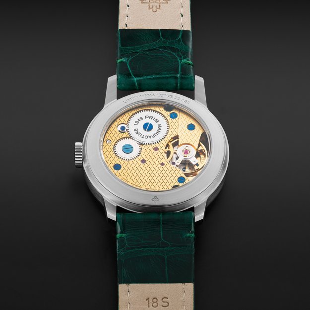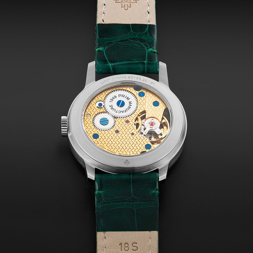 Zajímavé detaily najdeme také na spodní straně hodinek. Pod proskleným zadním víkem je ukrytý manufakturní strojek PRIM s ručním nátahem. Originálním prvkem je zdobení strojku drobným reliéfem, který připomíná otisk kola traktoru. Promyšlený design hodinek je dotažen k dokonalosti lahvově zeleným řemínkem z aligátoří kůže.