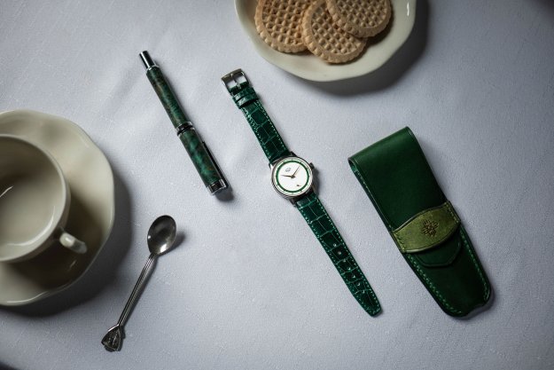 Balení hodinek obsahuje také pečlivě zvolené stylové doplňky. Exkluzivní plnicí pero ze smaragdově zelené karelské břízy. Odstín dřeva je připraven pouze pro tento účel. Barevné provedení mechaniky pera je přizpůsobeno provedení pouzdra hodinek. Autorem těchto per je společnost Wood-factory z Jizerských hor. Dvě kožená pouzdra v temně zelené barvě z nejkvalitnější kůže zpracované v Toskánsku, prošité nejlepšími lněnými nitěmi. 100% ruční práce, pod kterou je podepsán ateliér Mairych Leather Art. Jedno bude chránit hodinky při vašich cestách, druhé je určeno plnicímu peru.