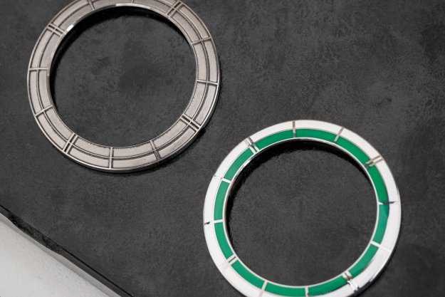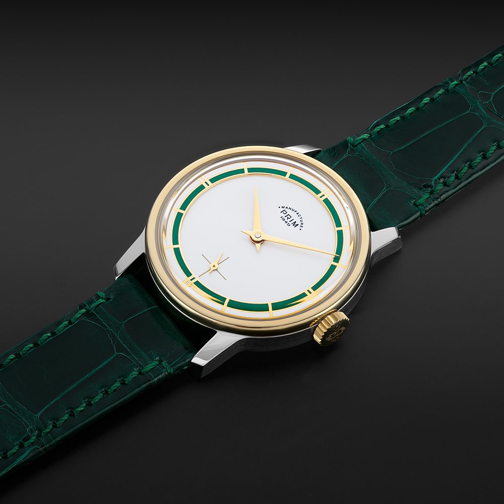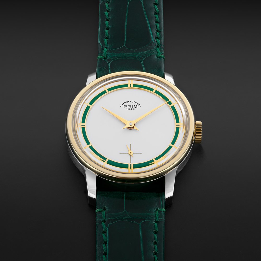 Nejvýraznějším prvkem designu limitované edice PRIM TRAKTOR 34 je bezpochyby propracovaný skládaný číselník. Kontrastní keramická objímka v atraktivní zelené barvě působivě vyniká na bílém podkladu. Elegantní vzhled hodinek je doladěn decentními zlacenými indexy a mimostřednou vteřinovou ručkou, typickou pro původní model. Nově navržené pouzdro o průměru 34 mm je svou velikostí a tvarem ideální pro každodenní nošení.