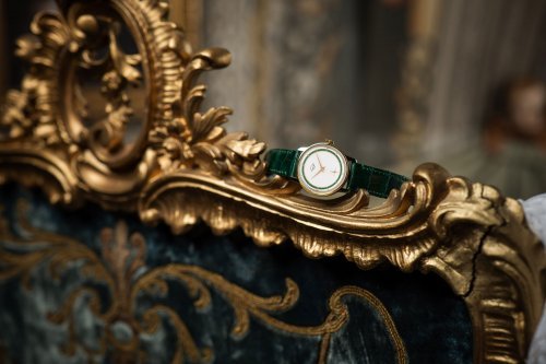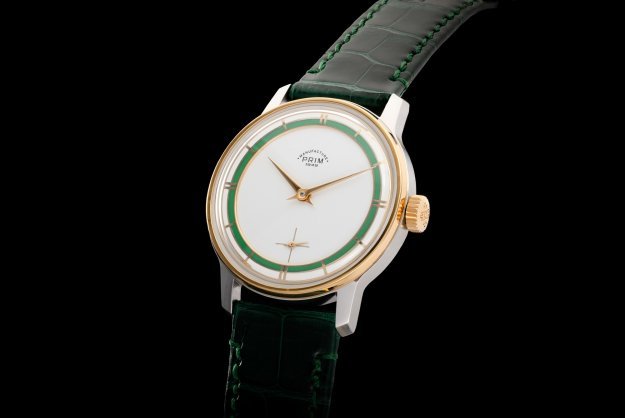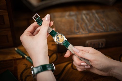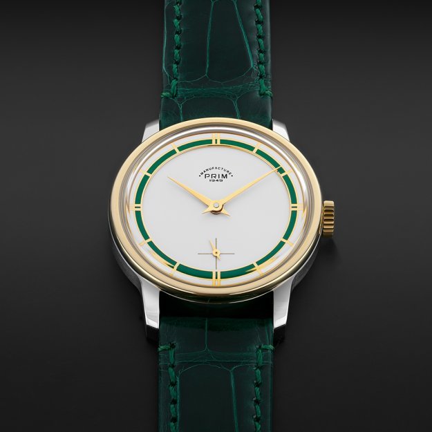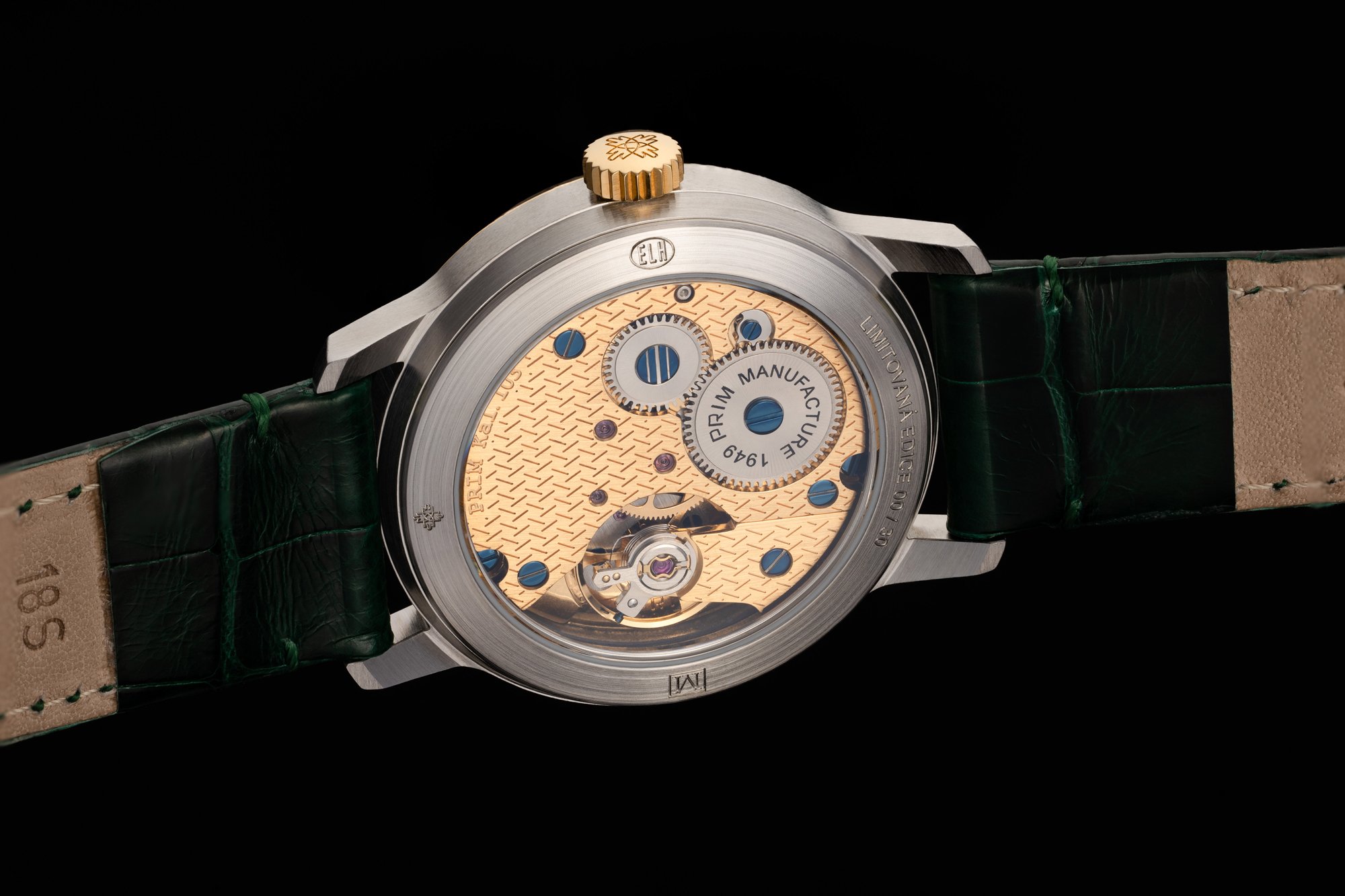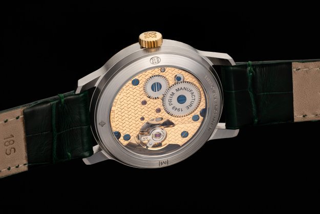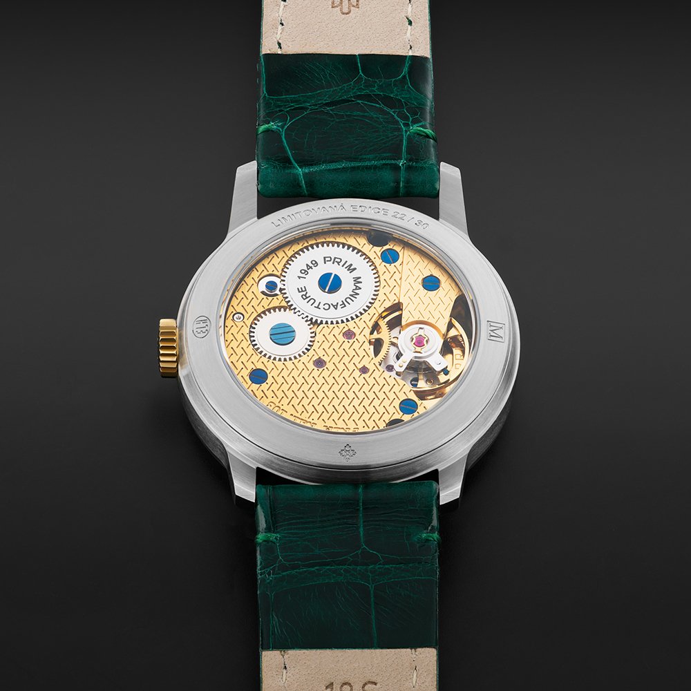 Zajímavé detaily najdeme také na spodní straně hodinek. Pod proskleným zadním víkem je ukrytý manufakturní strojek PRIM s ručním nátahem. Originálním prvkem je zdobení strojku drobným reliéfem, který připomíná otisk kola traktoru. Promyšlený design hodinek je dotažen k dokonalosti lahvově zeleným řemínkem z aligátoří kůže.