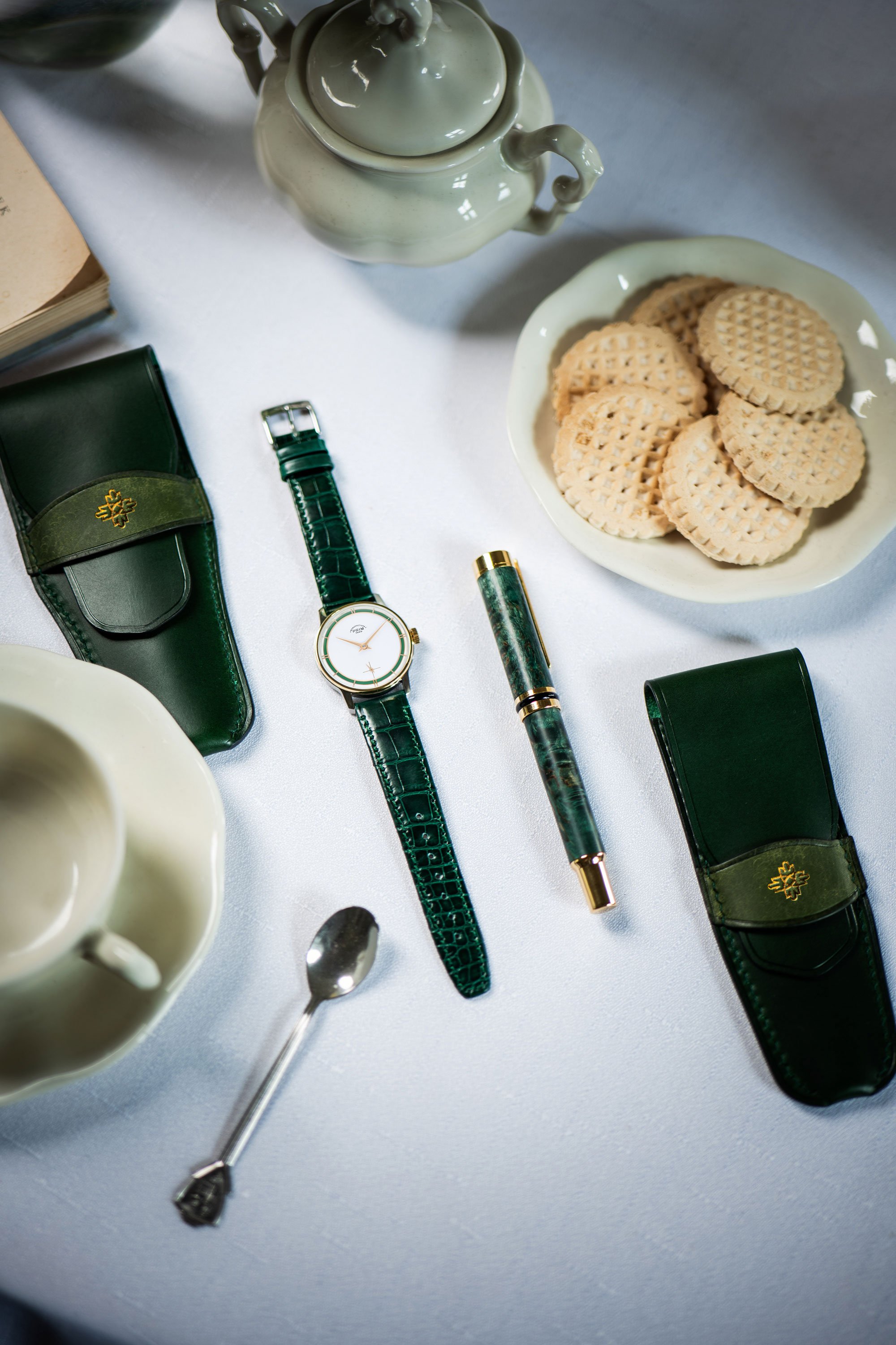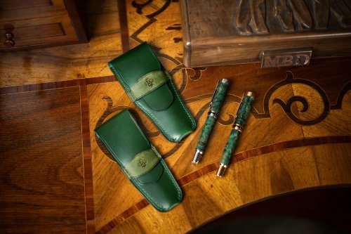 Balení hodinek obsahuje také pečlivě zvolené stylové doplňky. Exkluzivní plnicí pero ze smaragdově zelené karelské břízy. Odstín dřeva je připraven pouze pro tento účel. Barevné provedení mechaniky pera je přizpůsobeno provedení pouzdra hodinek. Autorem těchto per je společnost Wood-factory z Jizerských hor. Dvě kožená pouzdra v temně zelené barvě z nejkvalitnější kůže zpracované v Toskánsku, prošité nejlepšími lněnými nitěmi. 100% ruční práce, pod kterou je podepsán ateliér Mairych Leather Art. Jedno bude chránit hodinky při vašich cestách, druhé je určeno plnicímu peru.